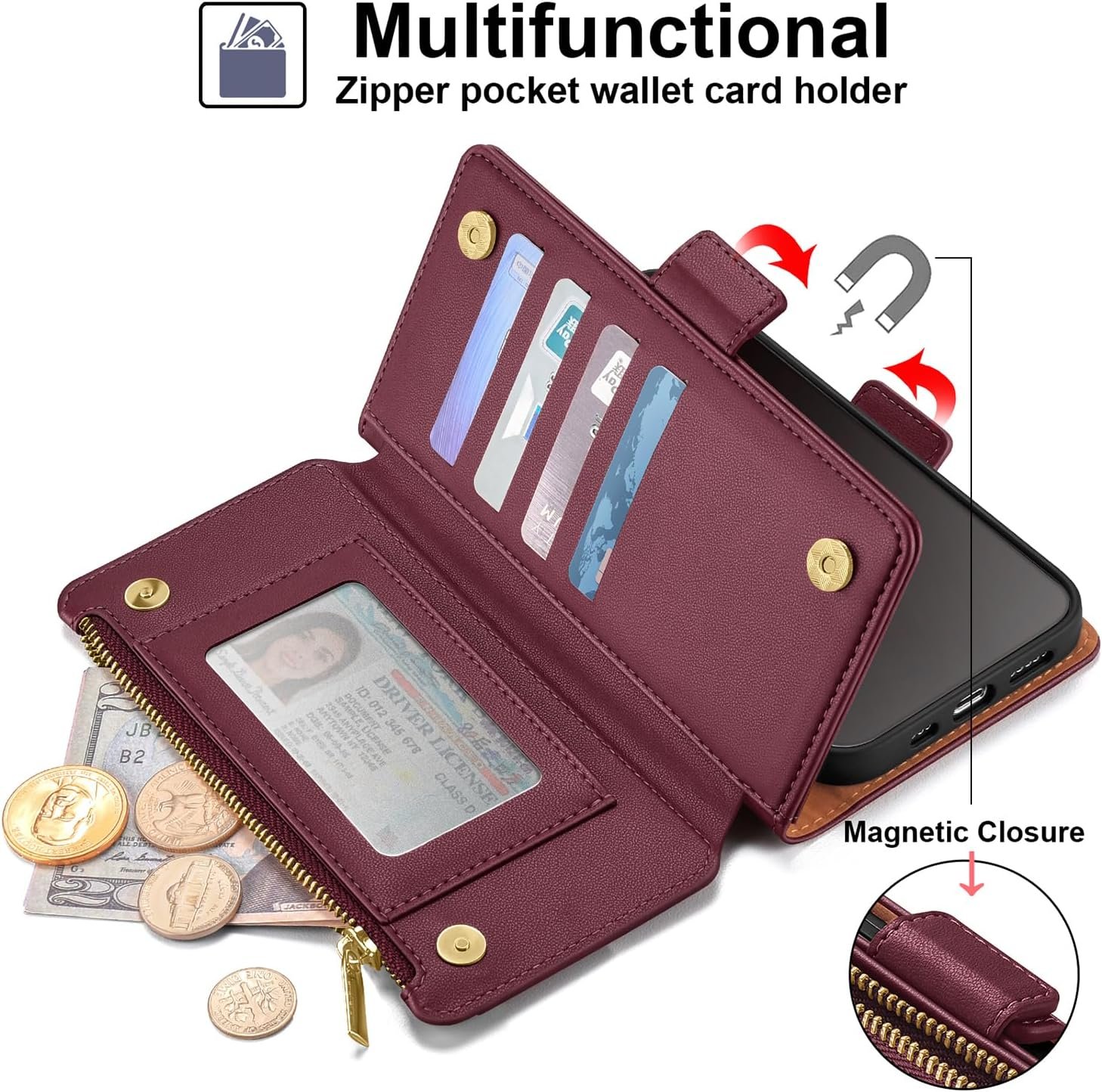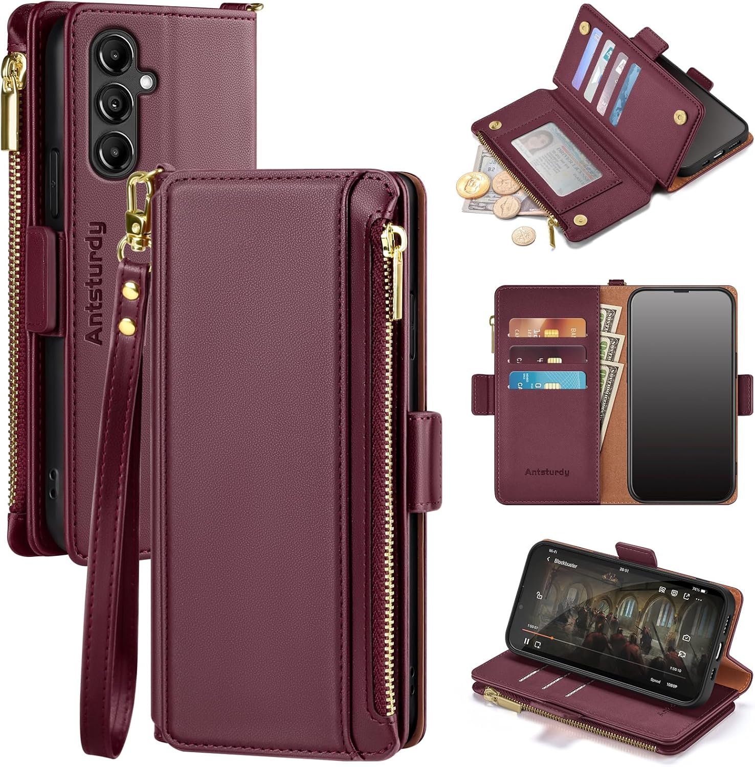 Antsturdy Samsung Galaxy A14 5G case Wallet with Card Holder for Women Men,Galaxy A14 5G Phone case RFID Blocking PU Leather Flip Shockproof Cover with Strap Zipper Credit Card Slots,Wine Red