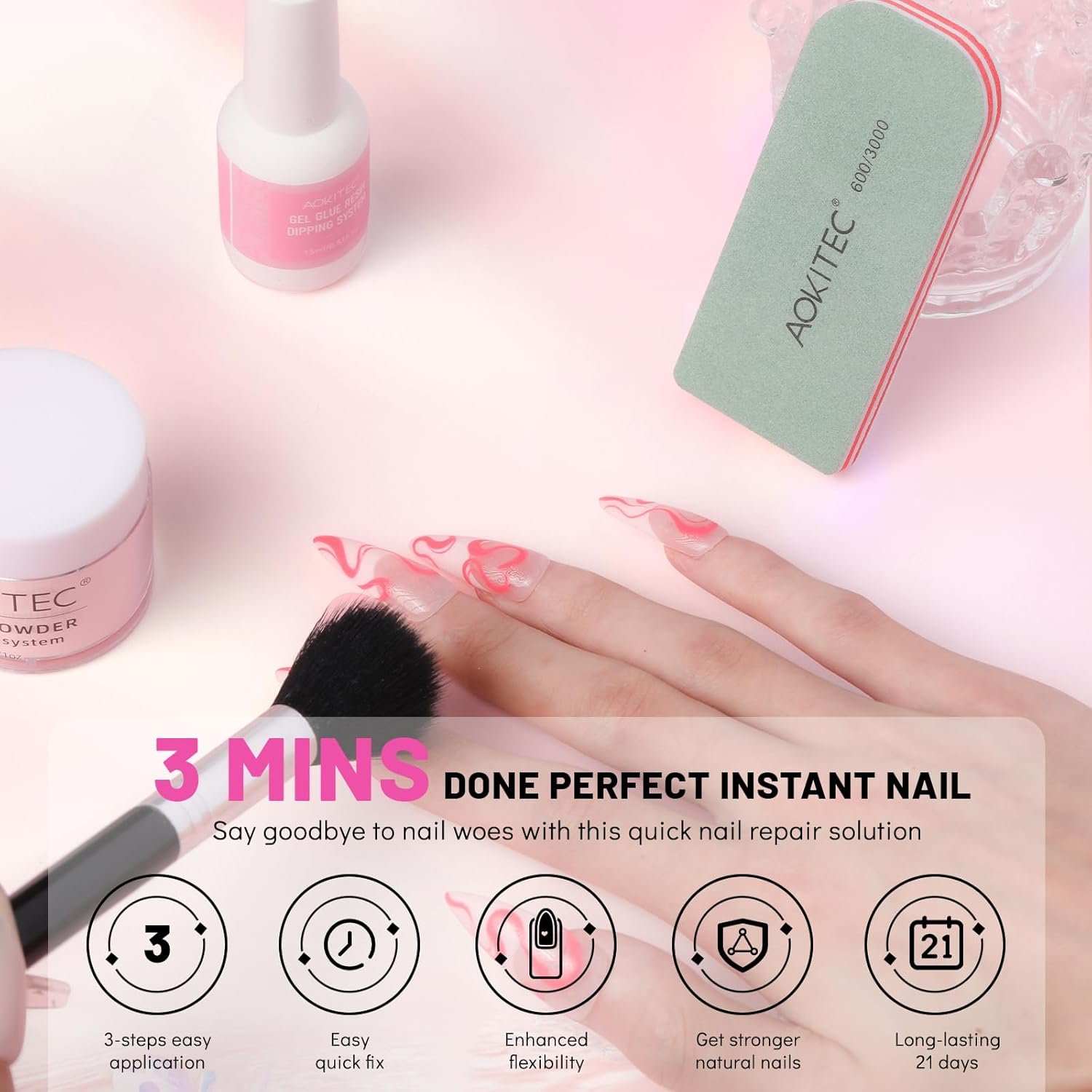 📍 Sincerely Tips – Apply in thin layers of nail glue resin instead of thick ones, as thick layers take longer time to dry and are more likely to chip. Revitalize your nails with Aokitec Nail Repair Kit – the ultimate solution for a flawless and enduring nail repair experience!