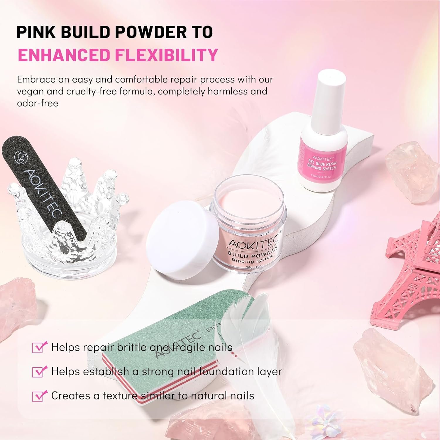 📍 Comprehensive Repair Solution – Aokitec build powder nail repair kit includes a powerful combination of 28g crystal jelly pink build powder, 15ml gel glue resin specially formulated to swiftly repair damaged or cracked nails. Equipped with nail tools (nail file and nail buffer) for easy application. Say goodbye to nail woes with this quick nail repair solution. Create your natural crystal jelly pink and beautiful nails.