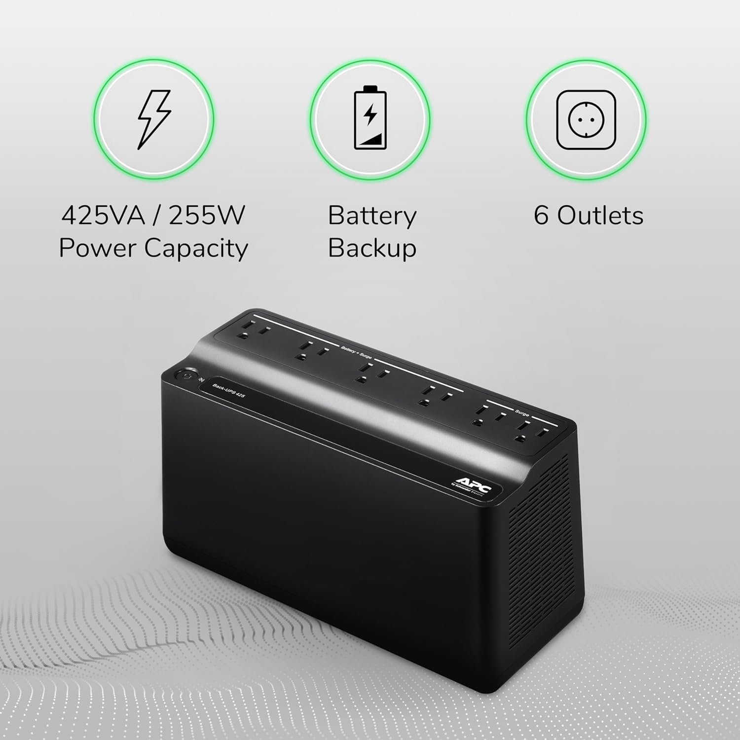This APC BE425M Back-UPS battery backup power supply offers guaranteed power and surge protection for wireless networks, computers, and other small electronics in your home or business. Backup battery power supply is designed for use during outages and unsafe voltage fluctuations, and provides surge protector with battery backup in the event of damaging power surges and spikes. The APC Back-UPS series are the perfect battery backup for routers to keep you and your smart devices connected.