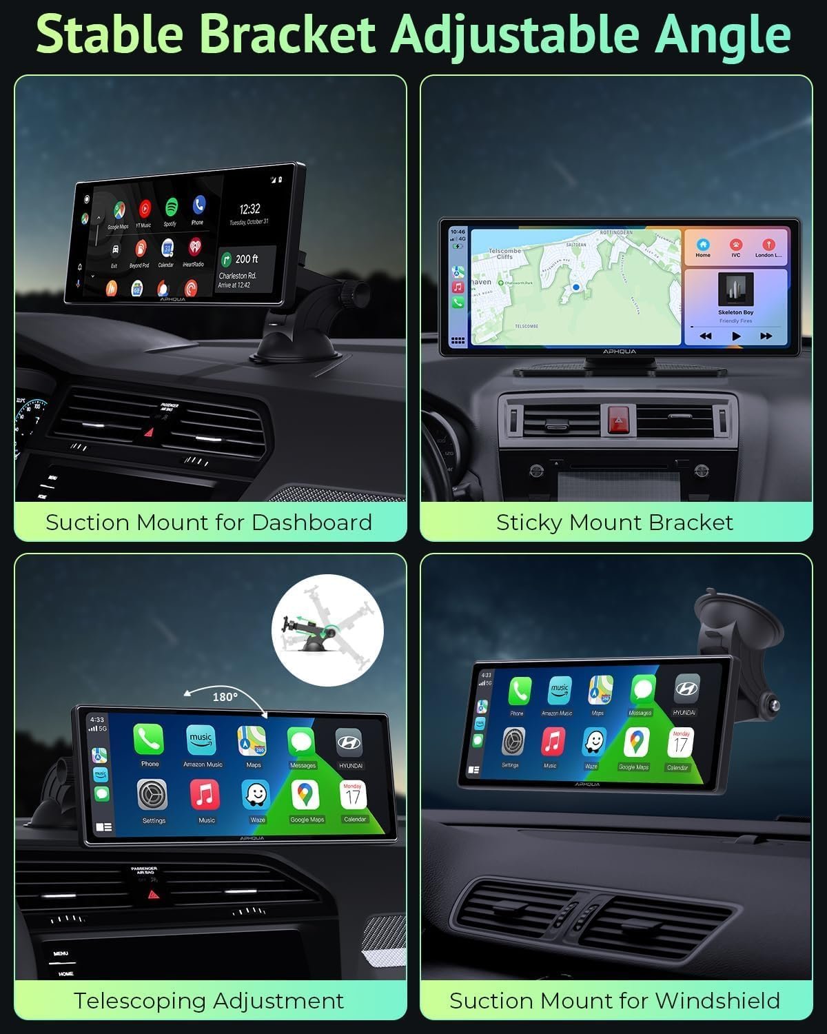 🚙【99% Car-Universal + Easy to Install】: APHQUA car play display comes with two different carplay dash mount,a 360-degree rotatable suction cup mount and a self-adhesive bracket to secure your dash console or dash windshield and can be easily removed and stored.In addition,it is powered by a cigarette lighter, and the cigarette lighter head is equipped with a USB charging port,And the USB interface on the caplay screen can be charged.which can charge your mobile phone .