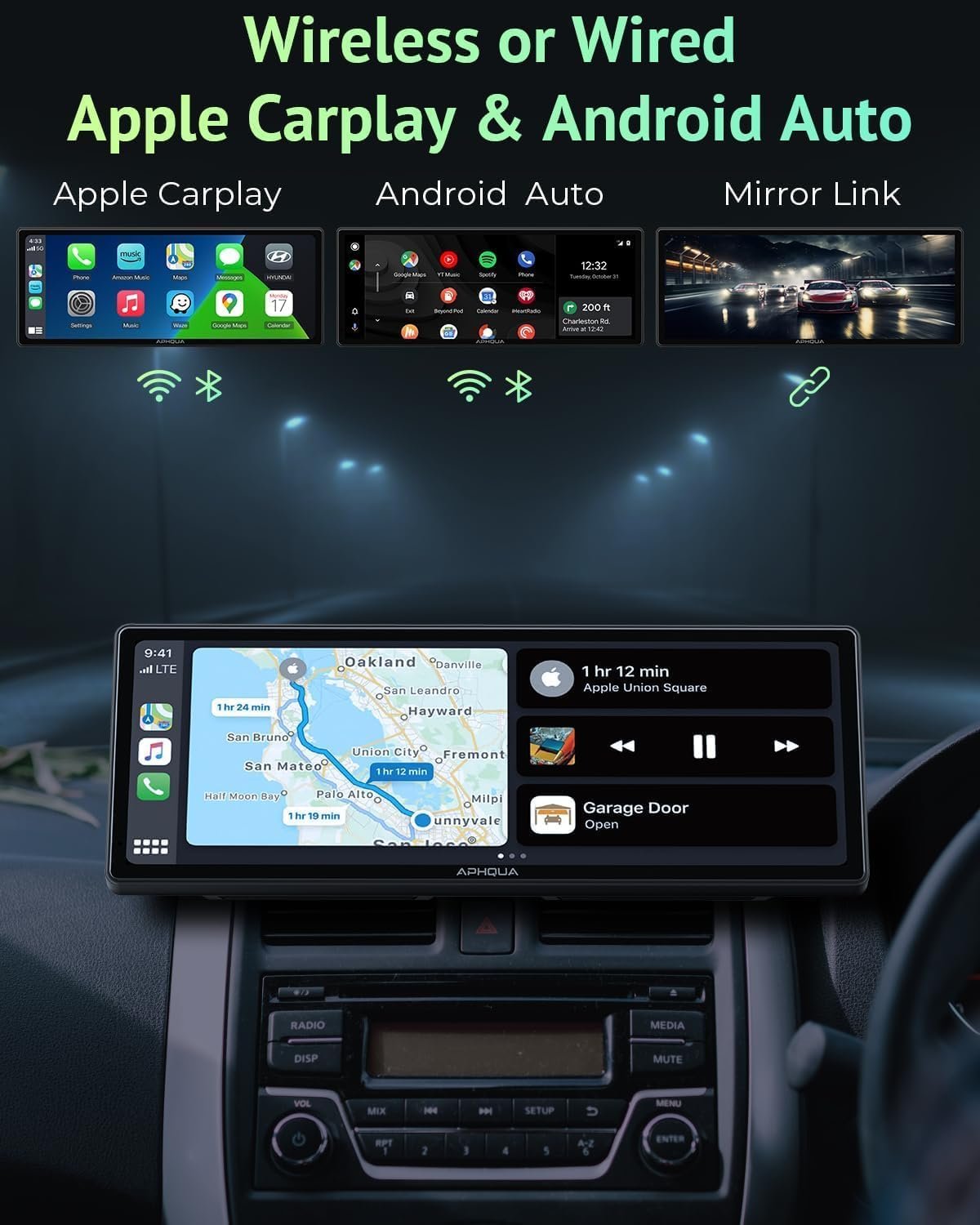 🚙【Carplay Box Intelligent Real-time GPS Navigation】: APHQUA drive mate screen connects with your smartphone through CarPlay or Android Auto, providing a real-time intelligent car navigation system, intelligent voice broadcast route and 10.26-inch ultra-clear screen display route, no need to look at the phone frequently No need to update the map frequently.