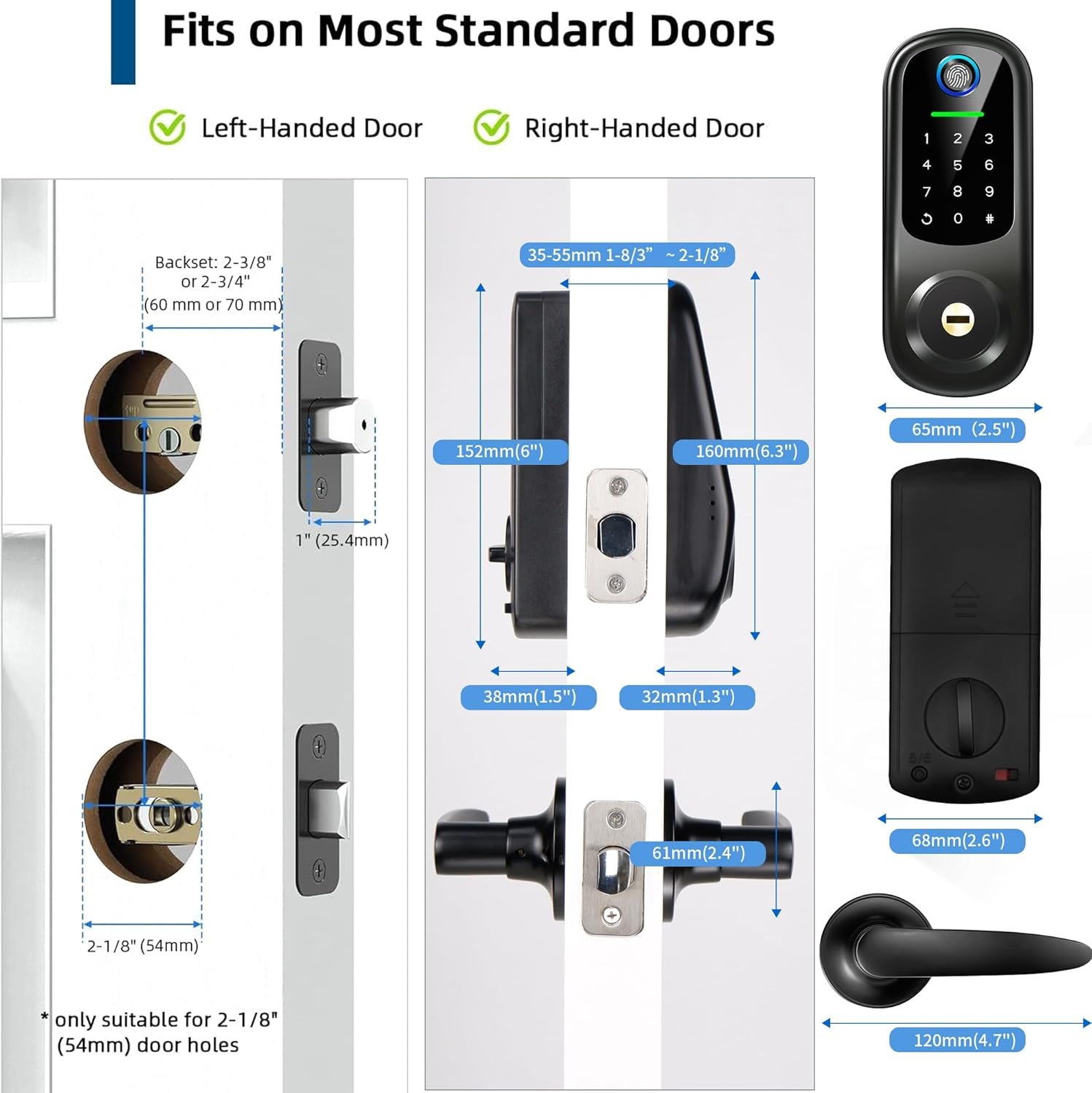 [Easy Installation] Easy to install the smart door lock by yourself. No extra drills needed. No locksmith needed. Deadbolt lock is suitable for both left and right handed doors. APP function will make it more convenient. Door thickness range: 35mm-55mm (1.37in-2.17in)