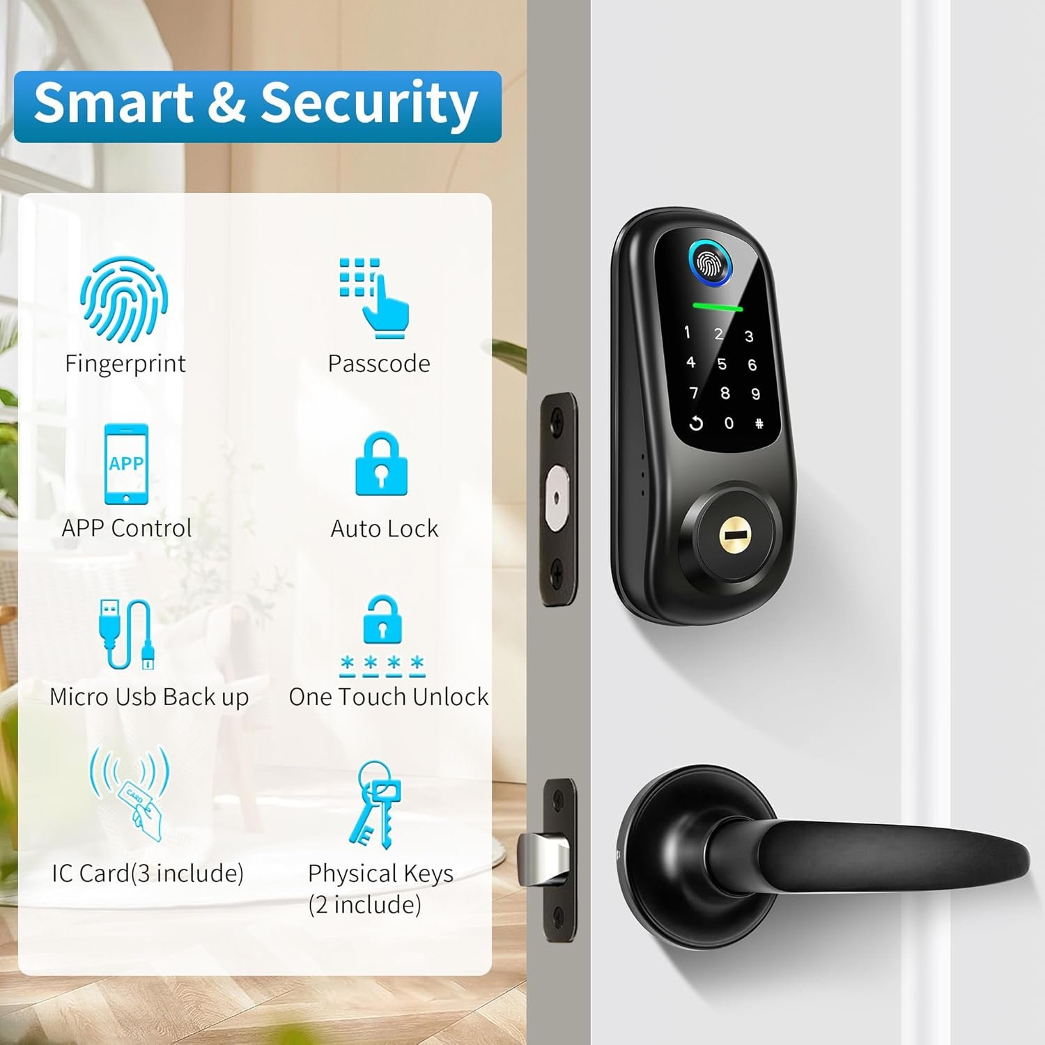 [Multi Function Keypad door lock] This door locks with keypads come with 300+ User, Anti-peeping password keypad, One touch lock, Auto lock, Mute mode etc. 2 backukeys and 3 ic cards are included.