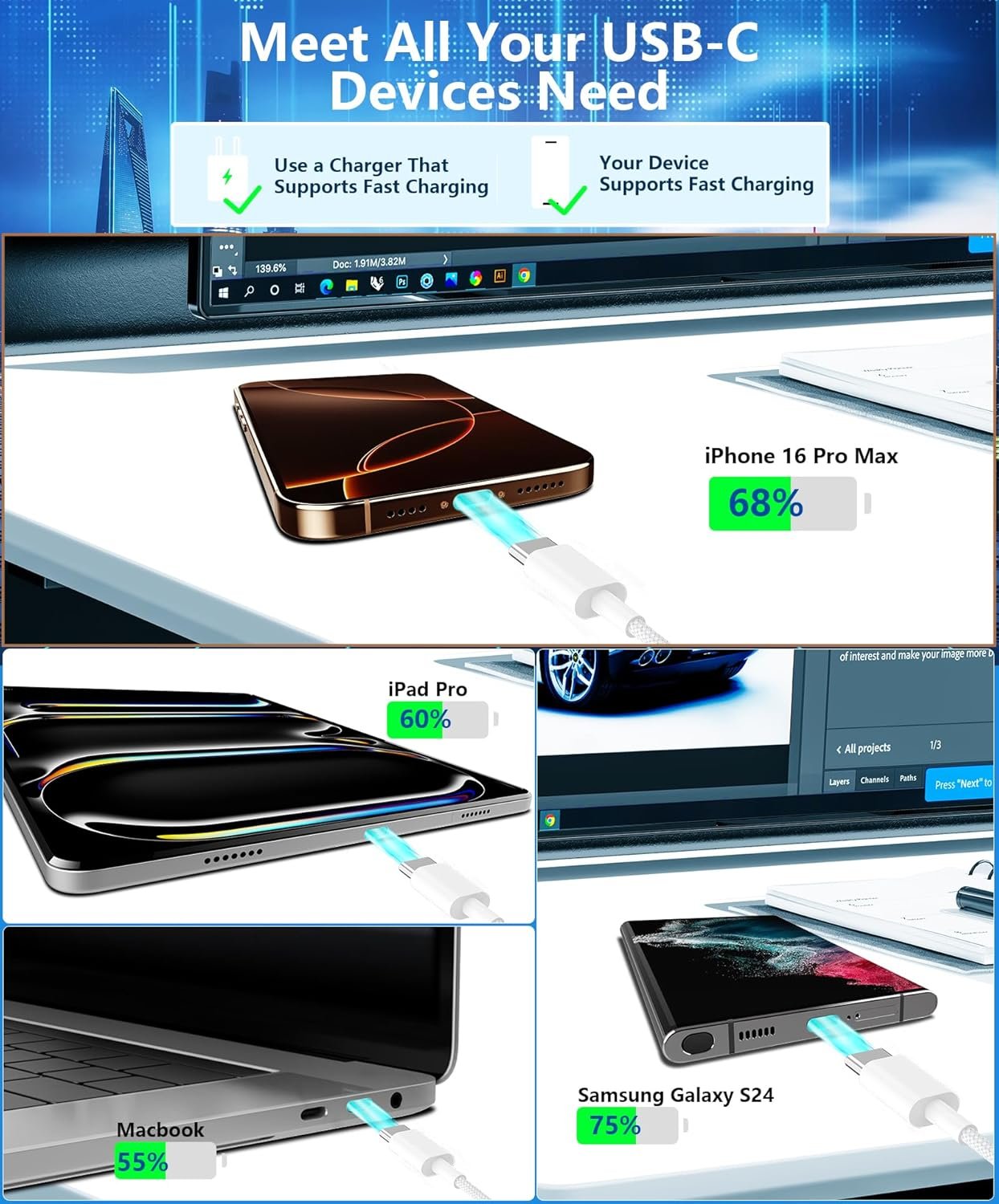 【MFi Certified 100W 6FT USB-C to USB-C Braided Cable】: Using Original USB-C Connector adjust voltage & current output, Provide overvoltage protection, battery protector and automatic chip recognition functions. Perfect compatibility with iPhone 16/16 Plus/16 Pro/16 Pro Max/15/15 Plus/15 Pro/15 Pro Max, iPad Pro/Air/Mini, MacBook, Galaxy S24 S23 S22 S21, Note 20 10, Galaxy Tab S10 S9 S8, Pixel 8 7 6 5, Moto, PS6 Controller, Cameras, GPS, Power Banks, Driving Recorders, Drone & ALL USB-C devices.