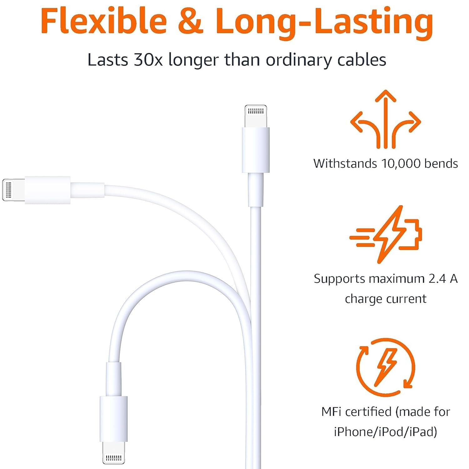 【High-Quality Cables Durability】: Our apple charger cord is built with high-quality materials, tested to endure 15000+ bends and 10000+ plug cycles—making it 12 times stronger than ordinary iphone charging cable. The upgraded lightning port and tangle-free design ensure long-lasting, reliable use
