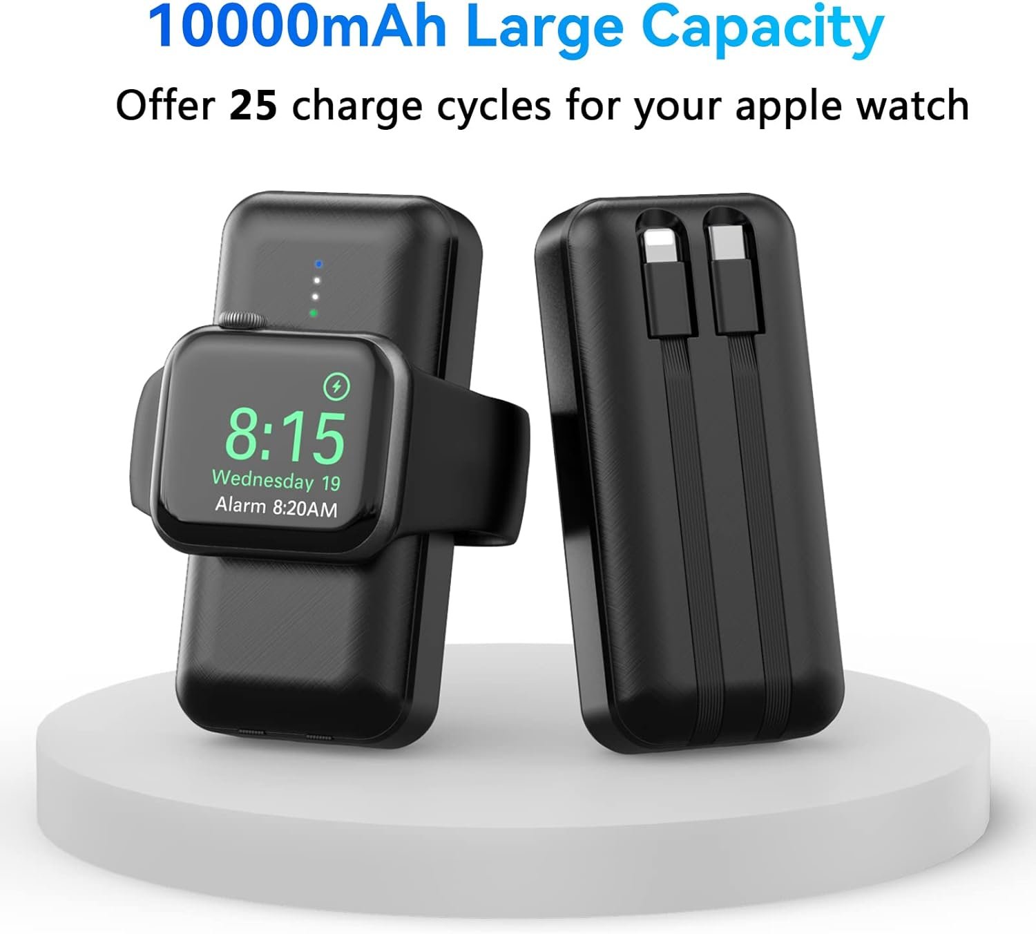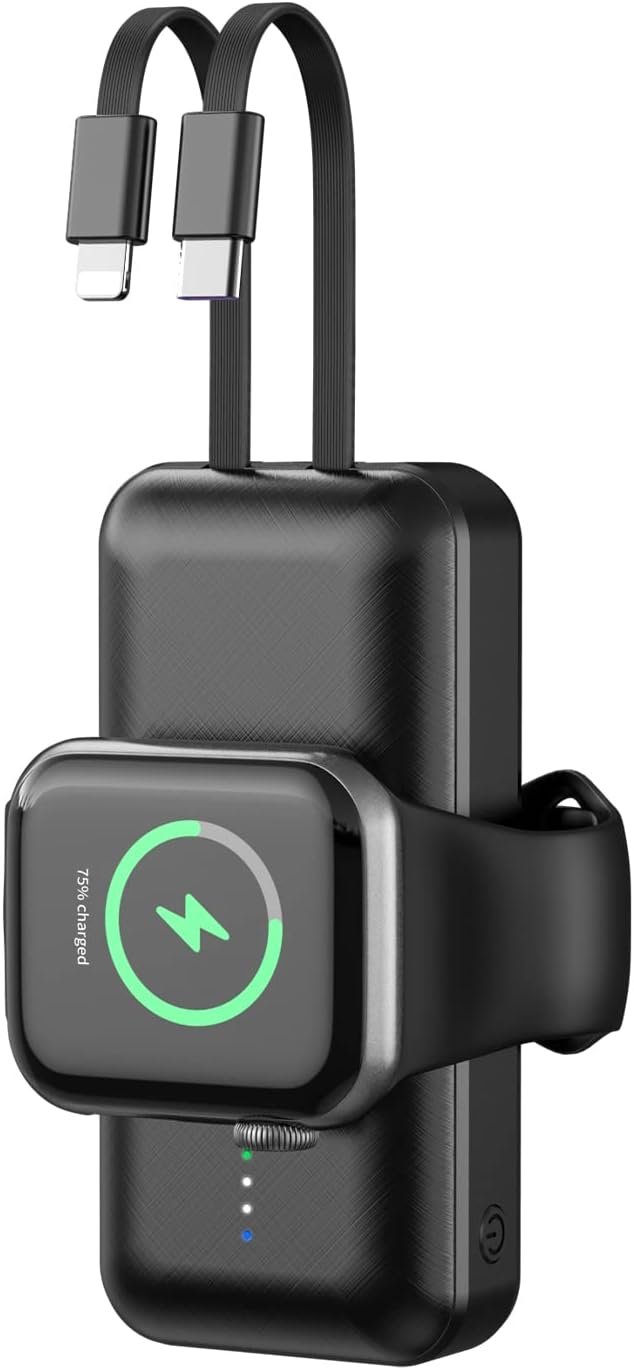 【Apple Watch and Phone Charger】 : The portable power bank has a wireless charging sensor panel and two built-in data cables to charge both the Apple Watch and the phone, Compatible for iWatch9/ Ultra / 8 / 7/ 6 / Se / 5 / 4 / 3 / 2 / iPhone 15/14 13/12/12 Pro Max / 11 /samsung Galaxy 22/21 series.