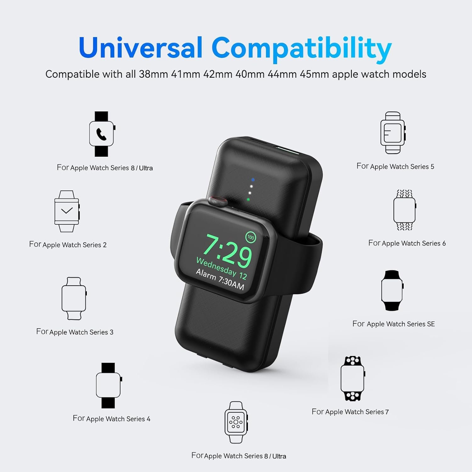 Support for iWatch 9/Ultra/8/7/6/Se/5/4/3/2/ iPhone/ Samsung series mobile phone charging, with multiple safety protection such as overcurrent protection, short circuit protection, overvoltage protection.