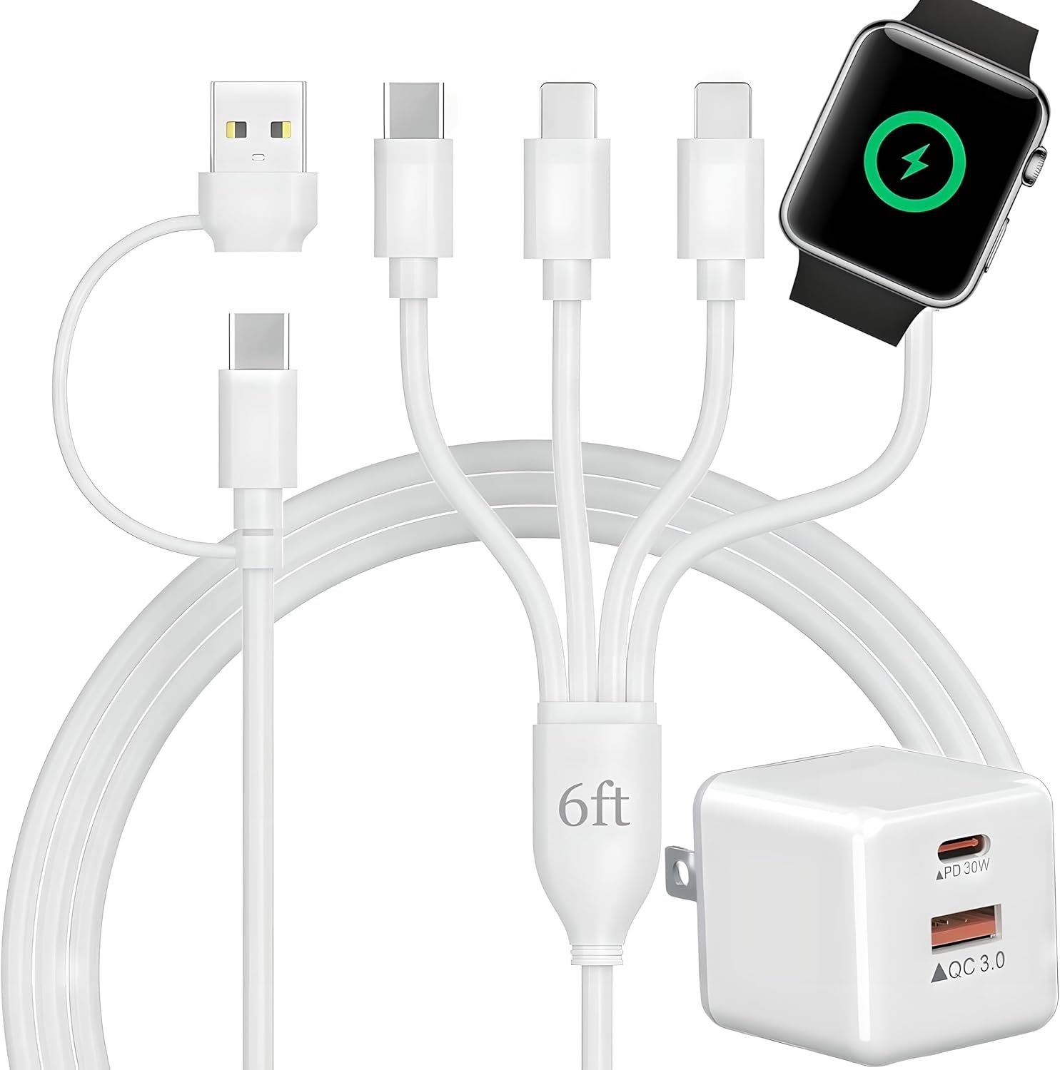 Streamline Your Charging Experience: Meet the innovative 4 in 2 USB C Watch iPhone Charger, designed to simplify and enhance your daily charging routine. This versatile solution lets you charge watches,Type-C devices, and 2 Apple devices all at once, utilizing a single cable witha 2-in-1 USB A/Type C port configuration. Your safety is our priority, as evidenced by its high temperature resistance and comprehensive protection features. The 30W Wall Charger Block Power Adapter ensures rapid power-ups, with full charges achievable in under 2 hours. It has foldable design for additional convenience. The 6.6FT length offers flexibility, whether you’re gaming, watching movies, or charging in the car. Light in weight and designed for portability, this Watch charging dock is the ideal travel companion to keep your devices powered anywhere. Say goodbye to cable clutter and hello to efficient, organized charging.