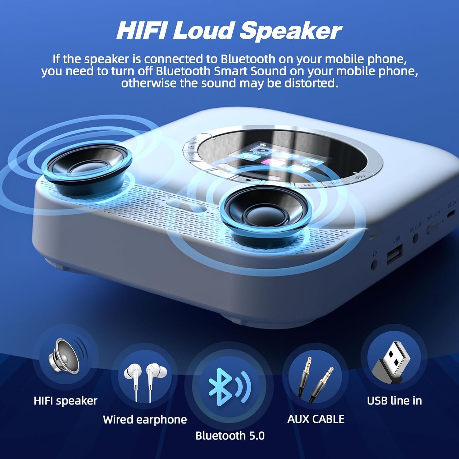 Bluetooth CD Player: This portable cd player with bluetooth can used as a receiver and a transmitter. The latest Bluetooth 5.0 technology provides a wider signal area, faster connection and transmission speed. This portable cd player is built-in 33-foot bluetooth 5.0 connectivity area, Built-in bluetooth receiver that can be connected to bluetooth enabled devices such as cell phones, tablets, bluetooth earphones, speaker or you can connect with your and use the CD players as a speaker