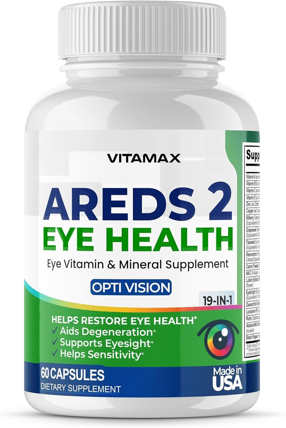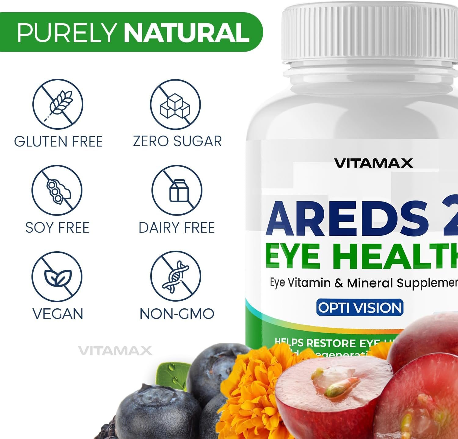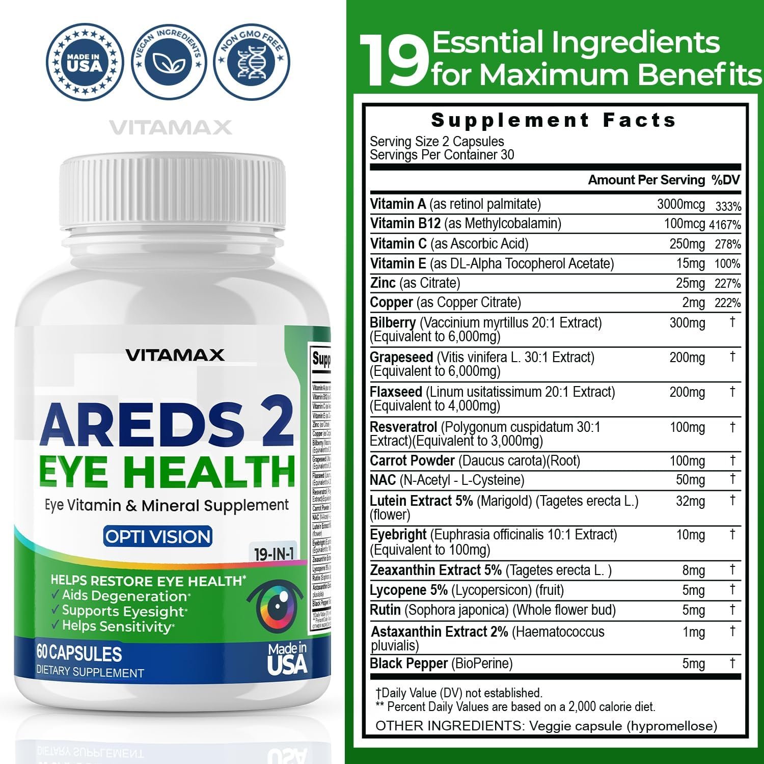 AREDS 2 Eye Vitamins – Lutein, Zeaxanthin, Bilberry, Astaxanthin Mineral Vision Supplement – Supports Eye Strain, Dry Eyes, Pressure, and Vision Health – Made in USA – 60ct