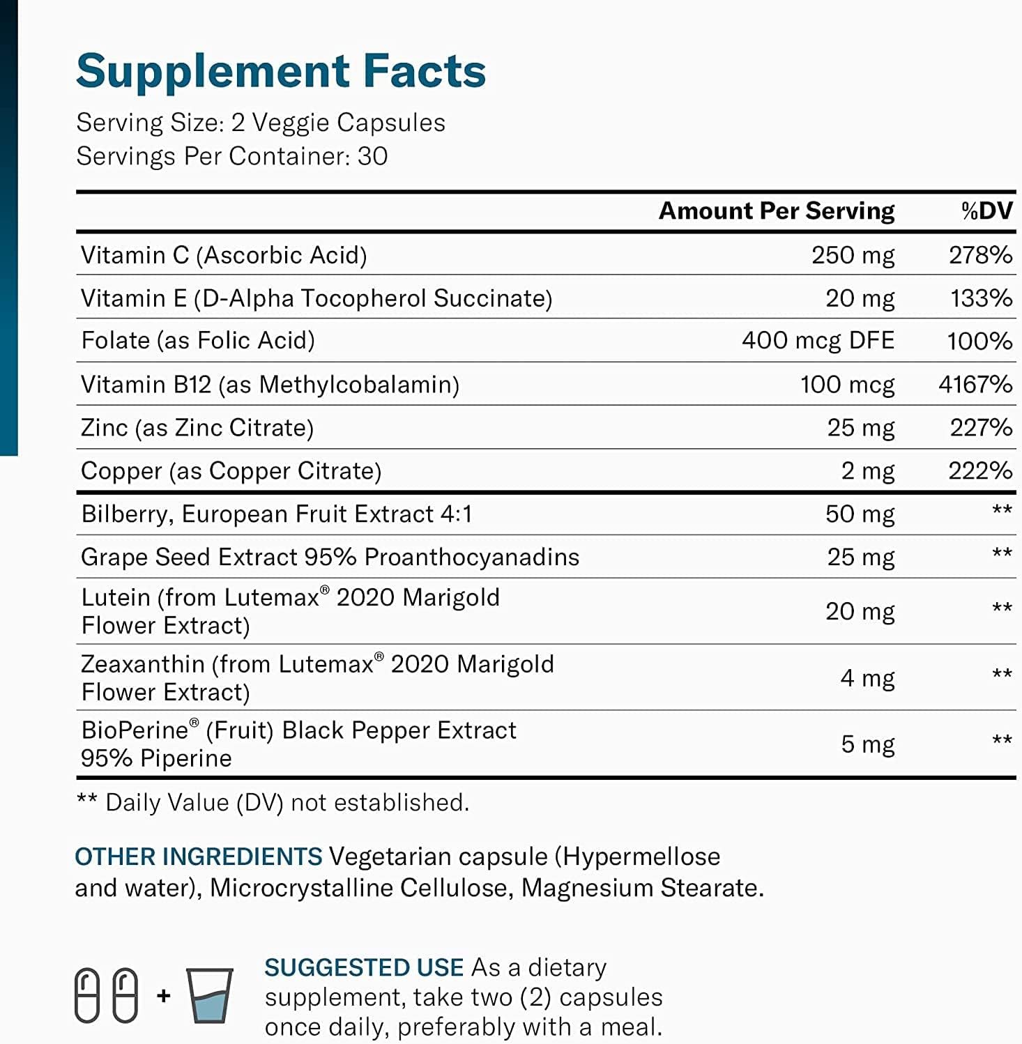 AREDS 2 Eye Support & Vision Vitamins: Our eye health supplement was crafted by experts to ensure optimal eye health support. Contains clinically proven Lutemax (lutein), Zeaxanthin, Bilberry extract, and Vitamin C, E, B12, Folate, Zinc, & Copper