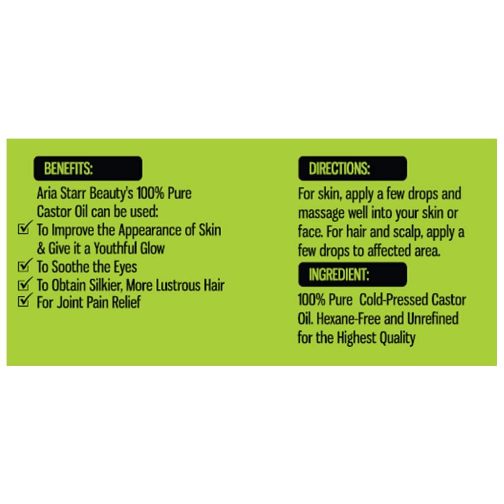Aria Starr castor oil includes only one ingredient: 100% pure cold-pressed castor oil. Our product is hexane-free, paraben-free, fragrance-free and preservative-free so you’ll receive only the purest oil. Castor oil delivers a variety of health benefits for your skin, body, and hair.