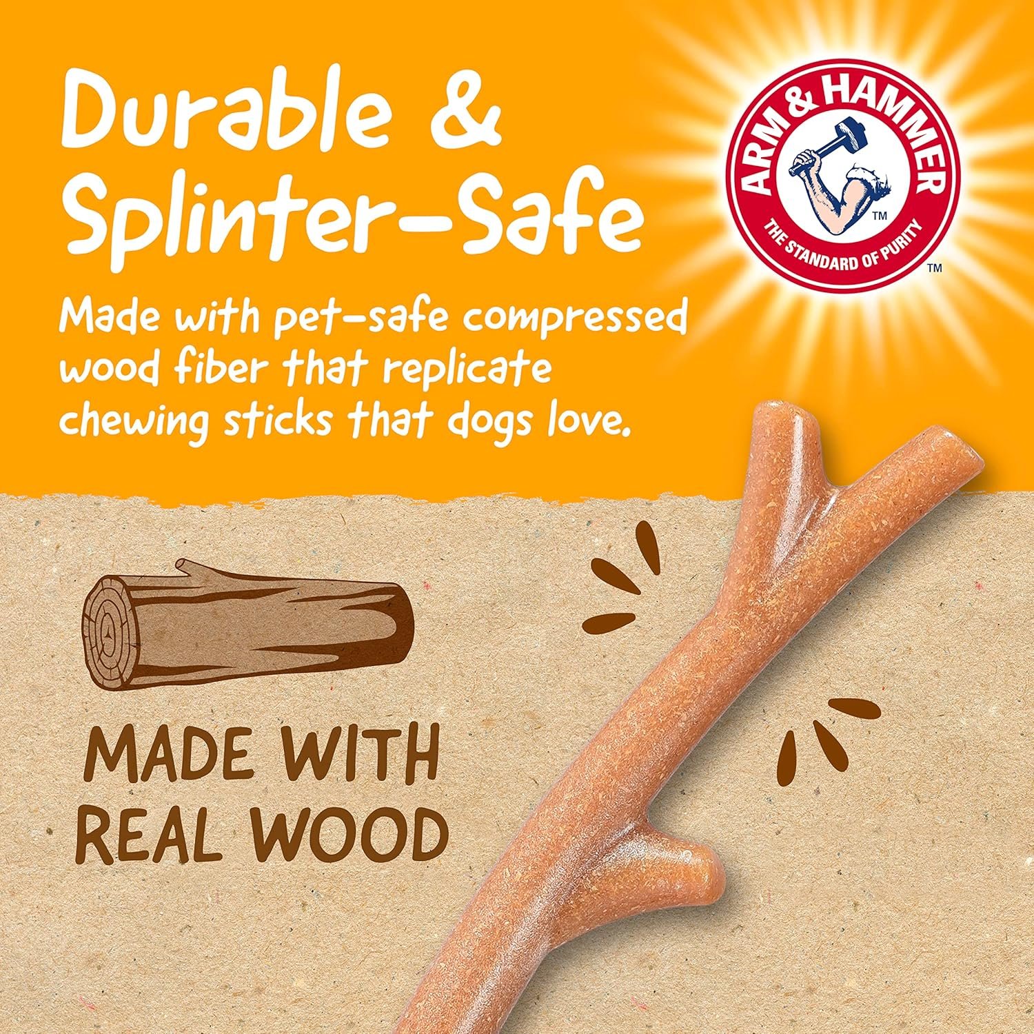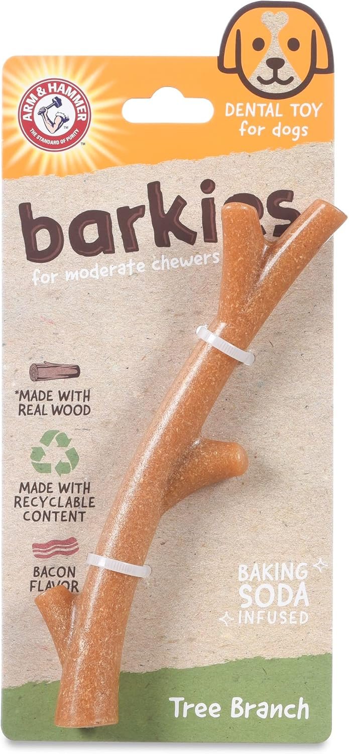 Only Arm & Hammer™ could create a splinter-safe stick that doubles as both a fun toy and a healthy dental chew. Made from blended and compressed natural wood fiber with pet-safe synthetic material, this chew toy replicates the sensory experience dogs love about chewing wood, but in a safer and sturdier chew toy. Additionally, this dog chew is infused with signature Arm & Hammer™ Baking Soda. Baking soda helps to absorb bad odor and has been shown to contribute to whitening teeth. Enjoy a few rounds of fetch with Fido’s new favorite stick, then let him entertain himself for hours with chewing! With an easy-to-grip shape for hours of easy chewing, delicious flavors, and signature Arm & Hammer™ Baking Soda, this is one chew toy that is approved by both dogs and pet parents alike! The Barkies Tree Branch measures 8” long and is bacon flavored. This faux stick is a more durable and safer alternative dog chew toy that is designed for dogs to enjoy chewing for hours without causing splinters that injure the gums. Plus, eco-friendly packaging and recyclable materials support Arm & Hammer™’s mission to offer versatile, effective, environmentally safe, and economical pet health products. When selecting your Arm & Hammer™ chew toys, select the proper size & chew type for your dog’s age, chew strength, & weight. Please supervise use & remove all separated parts. Product is not intended to be eaten or ingested. Arm & Hammer™ is the trusted name in gentle, yet effective cleaning for over the past 100 years. Now Arm & Hammer™ for Pets brings those same cleaning methods to our companion animals, becoming a leading dental brand in the pet space with a wide variety of products aiming to make it easier for pet parents to care for their canine companions. Check out our full line of Arm & Hammer™ for Pets products that offer an easy way for pet parents to find dental health solutions that work.