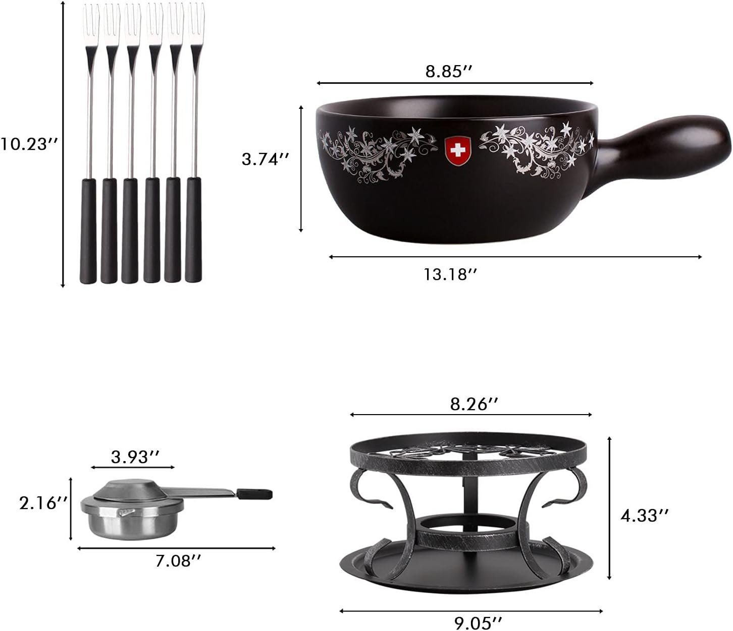 PERFECTLY FONDUE POT FOR FAMILY – Start a new tradition for your family with this Swiss fondue pot, and create more and more happy family hours! Our fondue set includes a heat-resistant ceramic pot, 6 fondue forks, a fondue burner, a metal stand, and a metal base plate. Fuel for burner NOT included