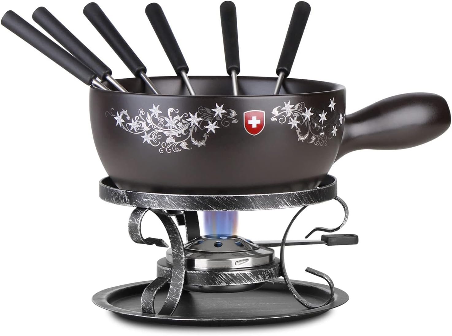 CERAMIC FONDUE POT SET – You can enjoy the European feel of artisanal fondue with our ceramic fondue, from cheese fondue to chocolate fondue. It features a Swiss Floral pattern designed that allows you to create an elegant centerpiece for your table setting. Get everyone involved at a fondue party with this kitchen accessory