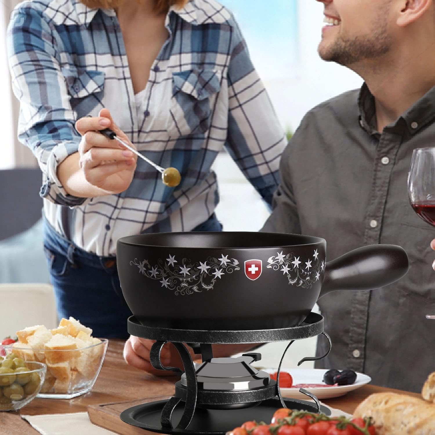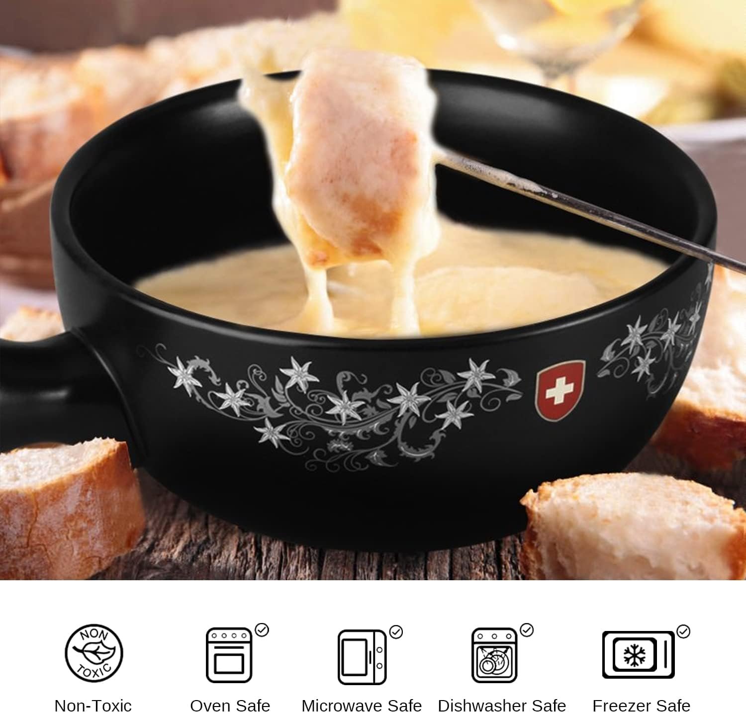 DURABLE QUALITY FONDUE – The black fondue pan is made of high-quality ceramic and can be heated on an open fire, on the gas stove, or in the oven. And our ceramic pot with a good thick bottom, that more evenly distributes heat and keeps your cheese from burning