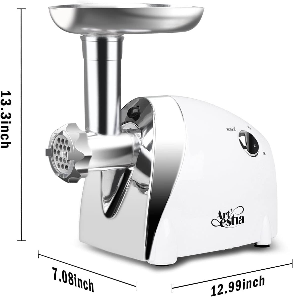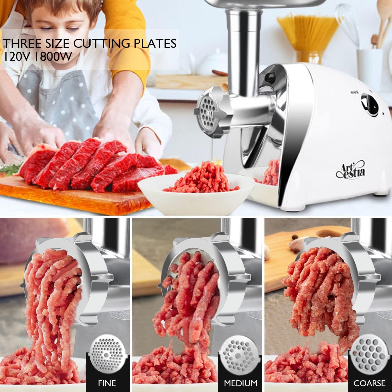 Artestia electric meat grinder engine with power up to 550W (1200 Max ). 3 pounds of minced meat can be produced per minute. This meat grinder is ideal for ground meat and stuffing making, fast and conveniently.