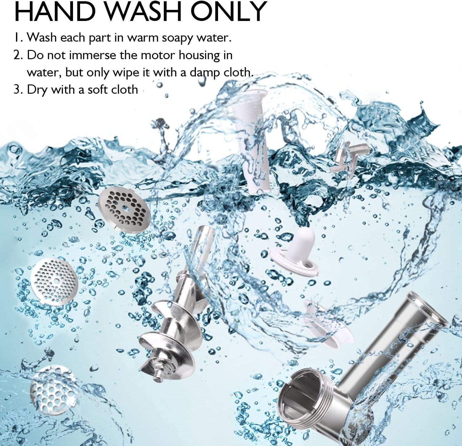 EASY TO USE & CLEAN – After assembling the parts, make sure the switch is in the “OFF” position, then plug the power supply (Voltage–120V, Frequency–60 Hz ) and turn the rotary switch to the “OFF” position, and feed the food. If something remained stuck, the “REV” button can unclog the unit easily. All parts can be removed and are easy to clean. NOTE: The parts of the meat grinder are NOT dishwasher safe. Please wash all parts (except body) in warm soapy water.