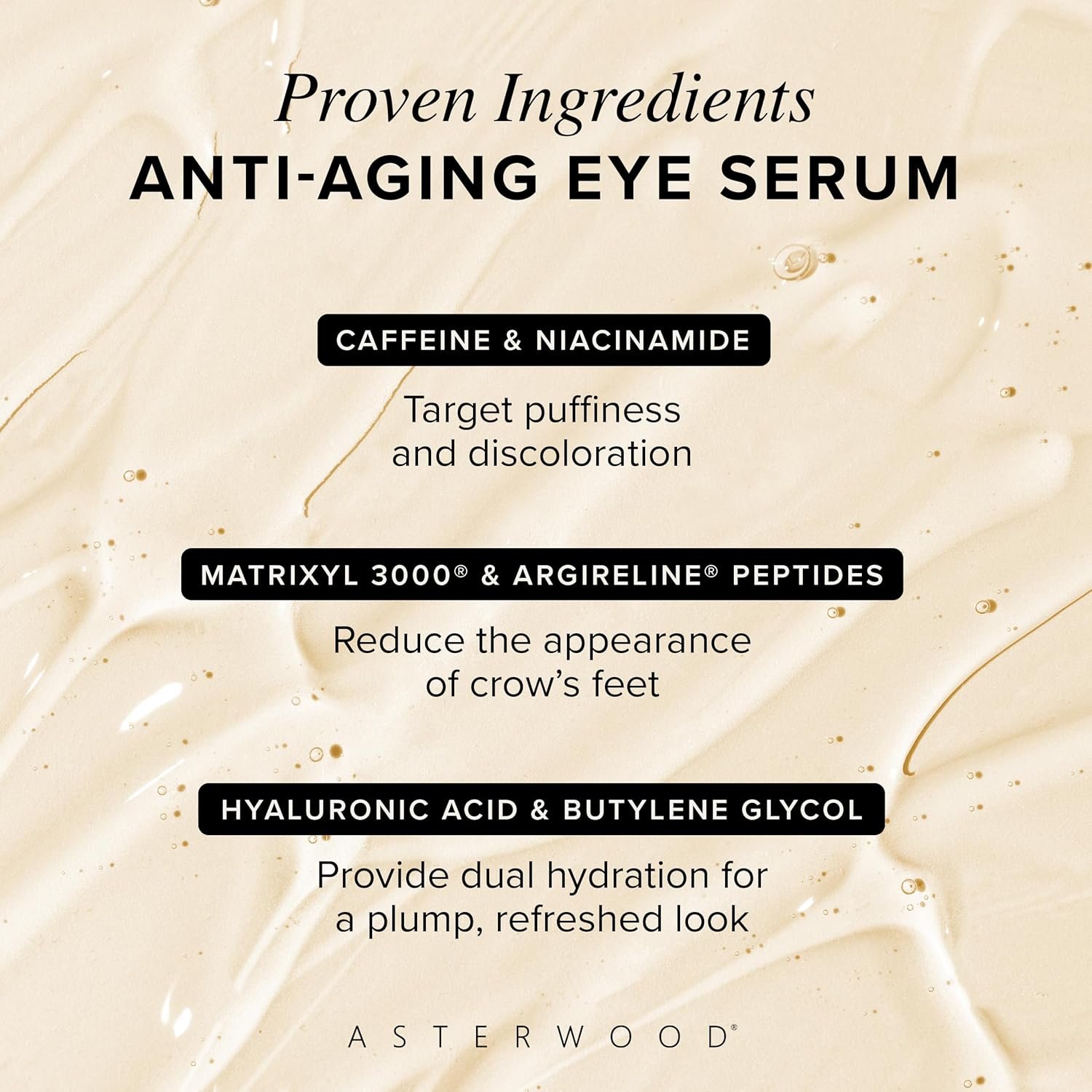 Anti-Aging Power: Asterwood Hyaluronic Acid Eye Serum is your go-to eye serum for dark circles and puffiness, packed with peptides to stimulate collagen, improve elasticity, and smooth fine lines and wrinkles for a youthful, vibrant look.