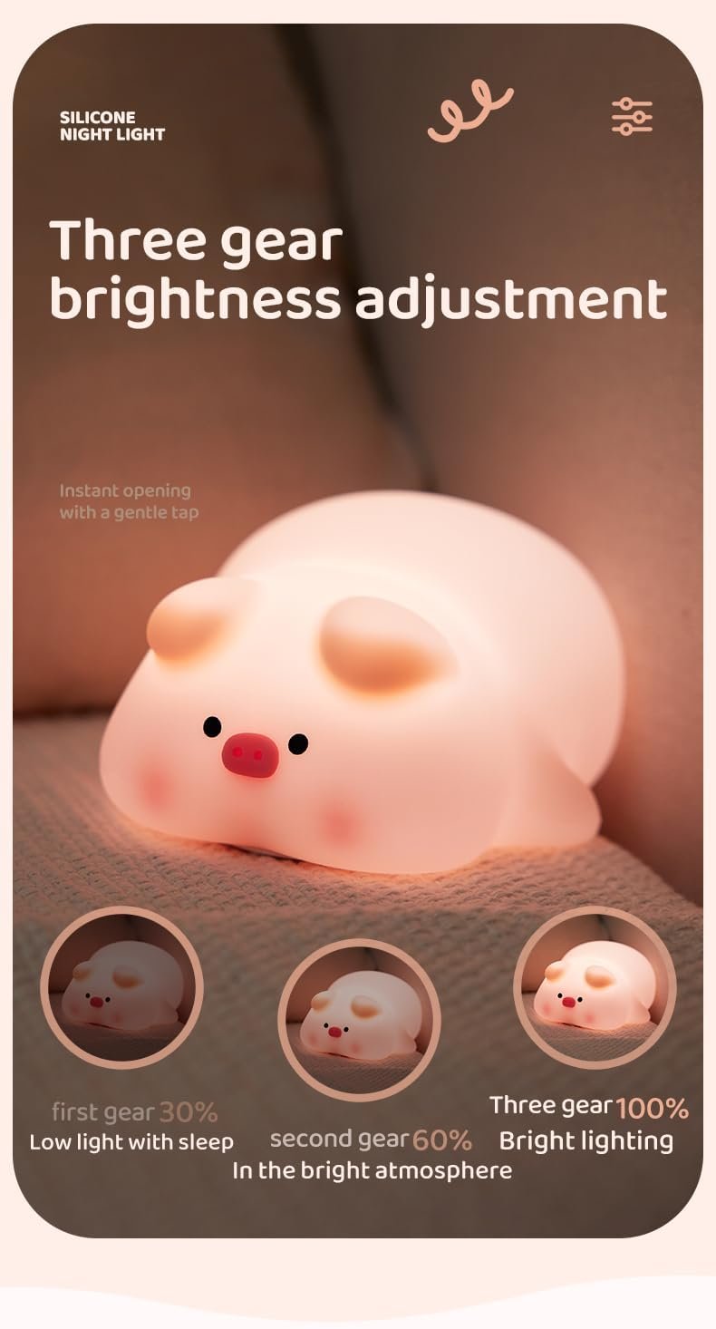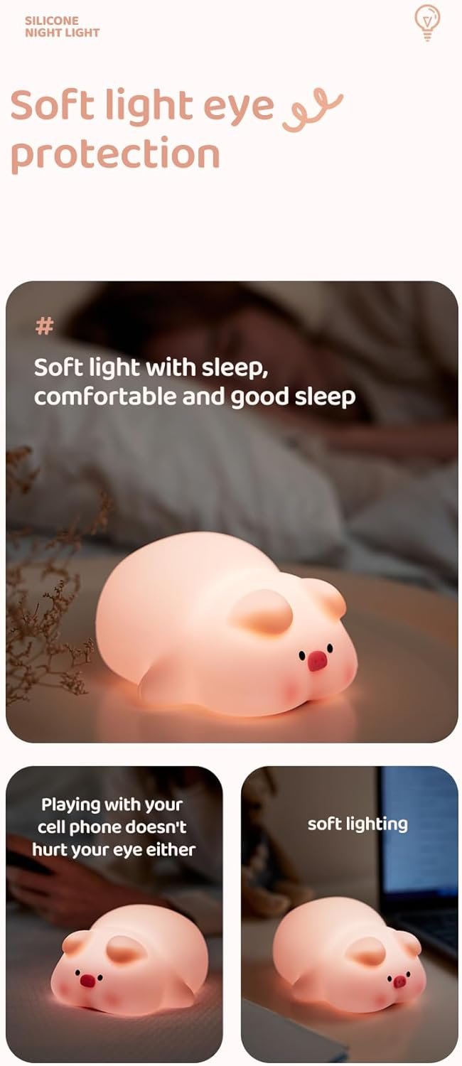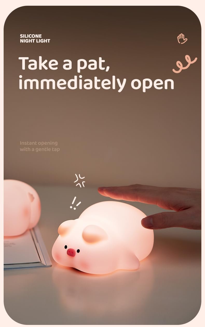 [BPA-free] Pig Night Light is made of safe and non-toxic food-grade silicone. As a touch-controlled baby night light that comes into contact with the body every day, we use the highest grade food-grade silicone that is BPA-free. Soft silicone can be kneaded freely and springs back quickly. The silicone exterior is thickened to prevent easy breakage or damage. It can be your stress reliever instantly. It is a baby night light and a stress relief toy.