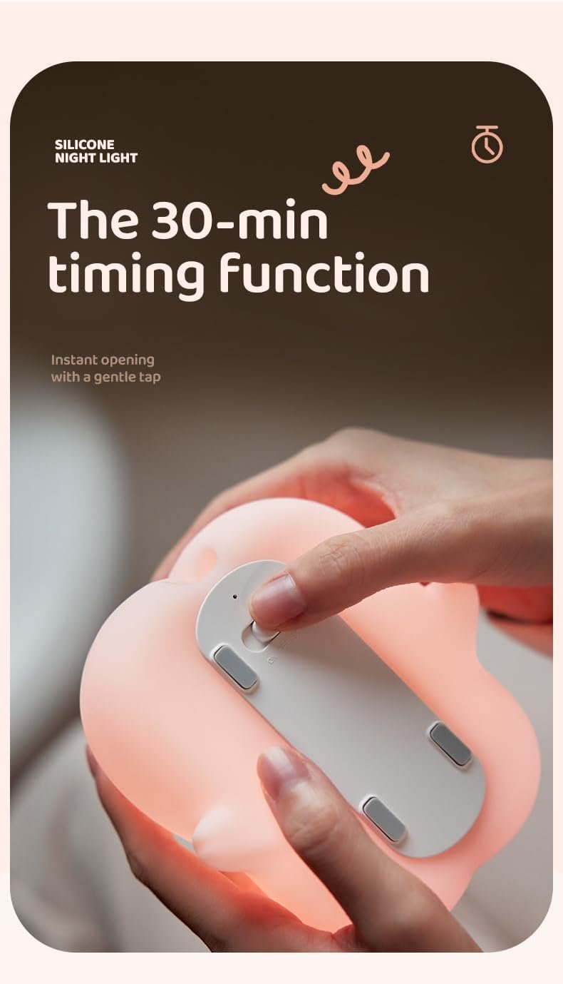 [Humanized Mode Adjustment]Pig sleep night light has 3 levels of brightness adjustment, which can meet your different needs. Low light mode is suitable for breastfeeding, sleeping, and getting up at night, and high light mode is suitable for diaper changing and lighting. There’s also a timer mode where you can preset the auto-off time to 30 minutes.