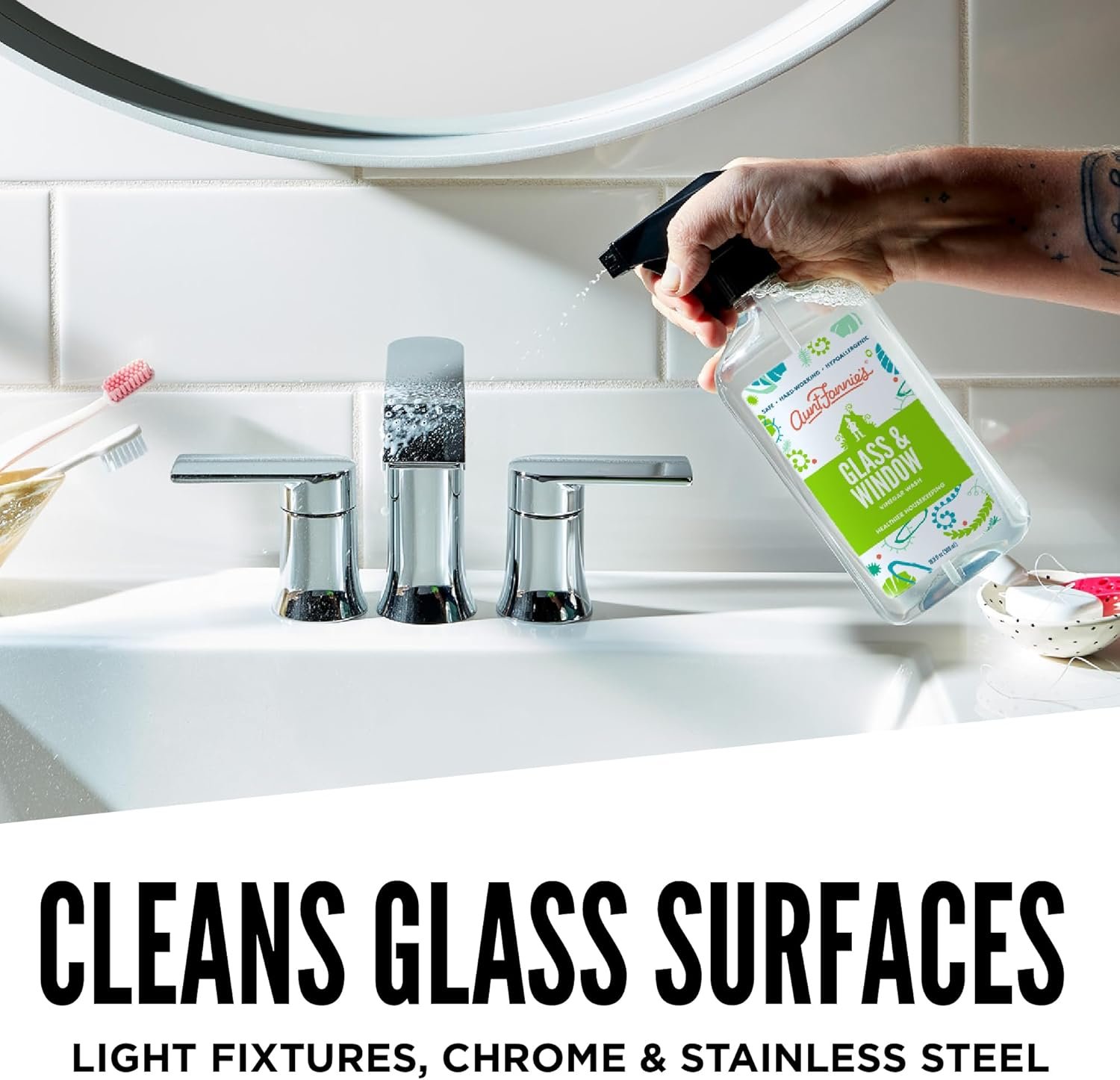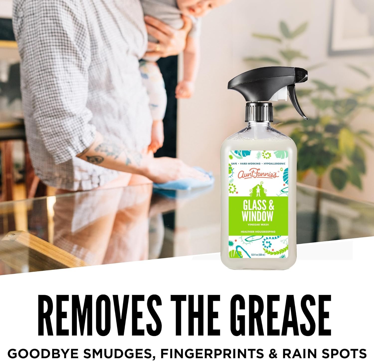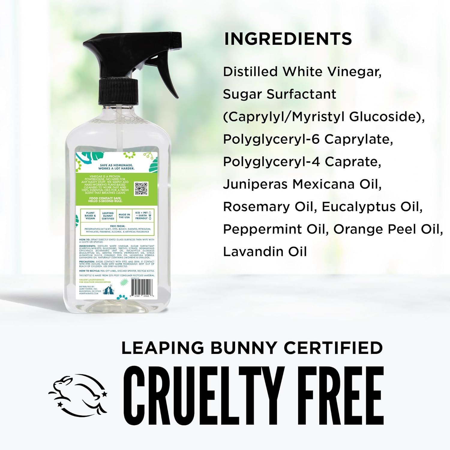 Aunt Fannie’s Glass and Vinegar Cleaning Spray: Our formula uses the power of vinegar and plant-based cleaners to remove smudges, fingerprints, rain spots, oil, and dirt