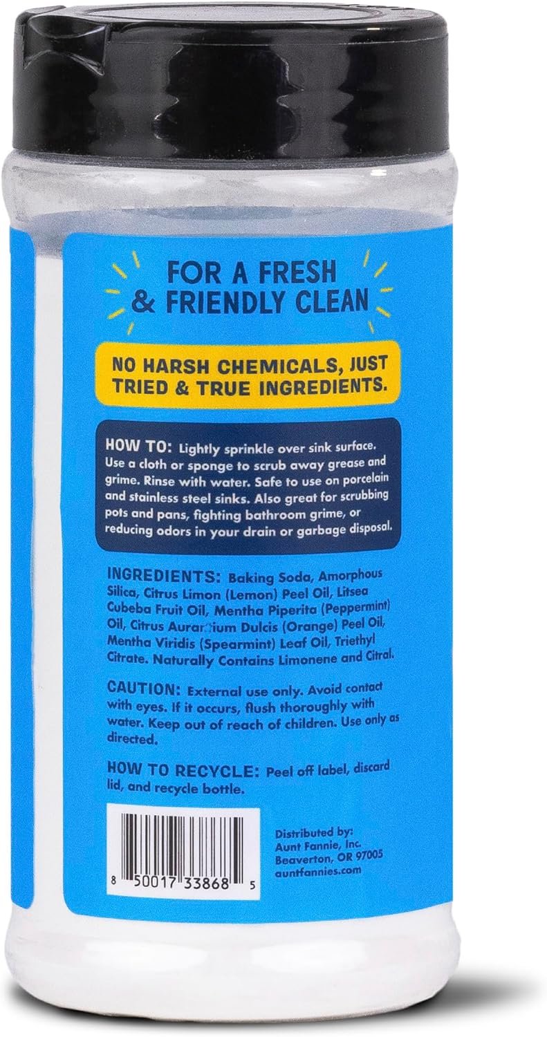 Aunt Fannie’s Sink Refresher: Lemon scented powder packed with the power of baking soda to scrub away stubborn food, grease and stains while also deodorizing sinks & drains