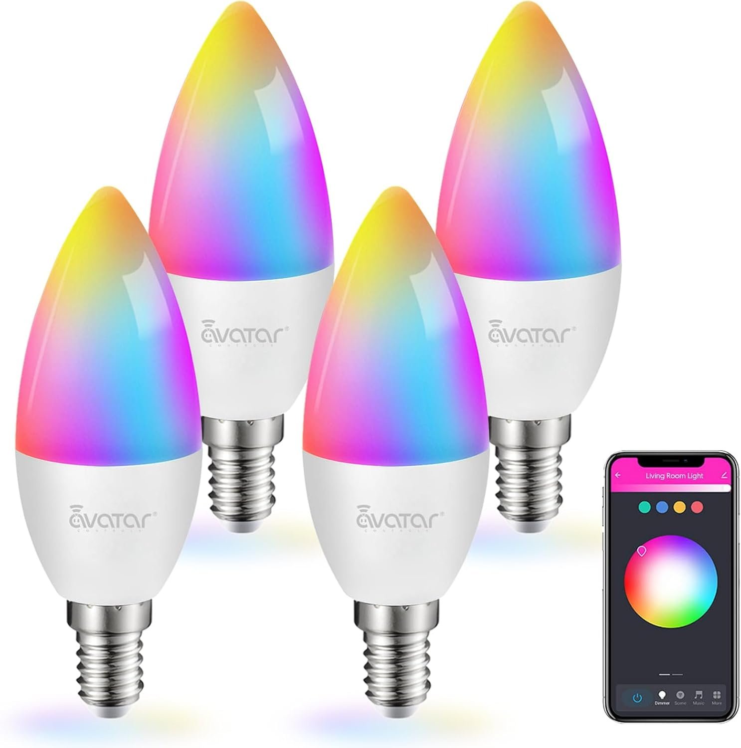 Avatar Controls 4 Pack Wi-Fi Smart LED Light Bulb, Dimmable, E12 Base Candelabra Smart Light Bulbs Color Chnaging Timer Music Sync, 5W, Compatible with Alexa & Google Assistant