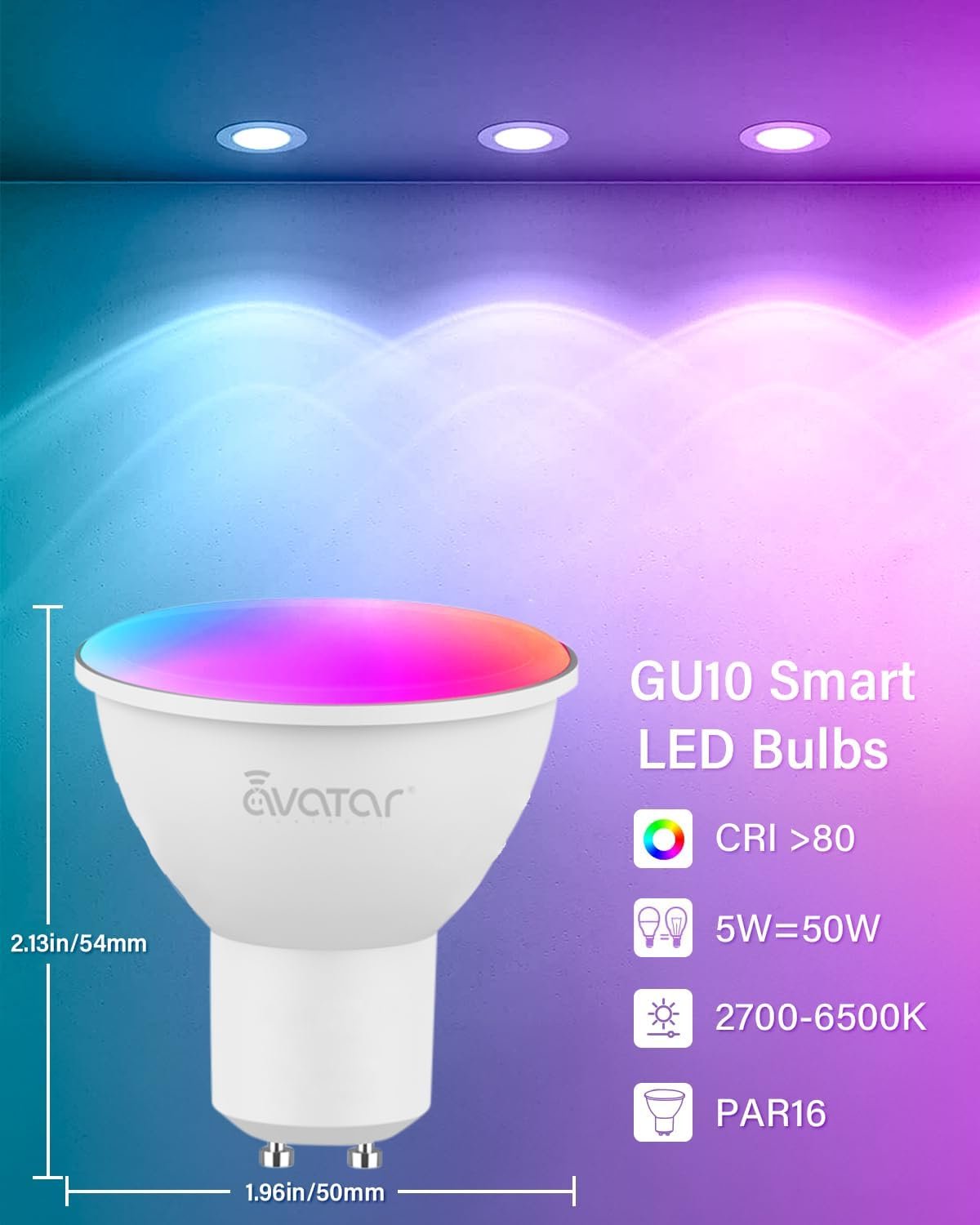 【Smart Voice Control 】Avatar Controls gu10 smart bulbs are compatible with Alexa, Google Assistant, SmartThing, Siri, voice control and hand free. “Alexa, turn on the string light” “Google, turn to blue”