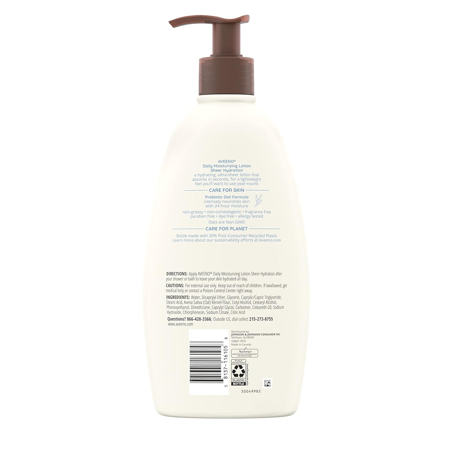 18-fluid ounce bottle of Aveeno Sheer Hydration Daily Moisturizing Body Lotion to nourish, replenish and intensely hydrate dry skin for 24 hours of moisture while leaving a lightweight, breathable feel on skin