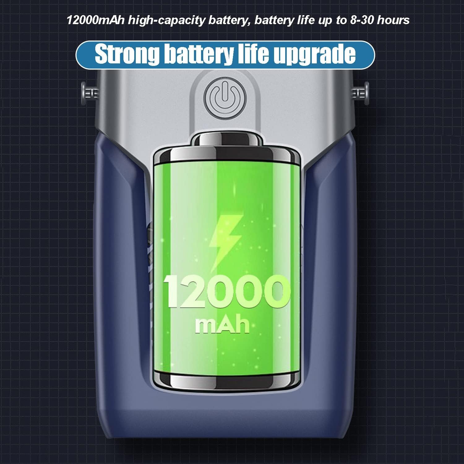 [Long Working Time]Built with rechargeable 12000mAh large capacity Polymer battery, the portable mini fan supports up to 30 hours long working time while blowing out gentle wind at a low speed. Cool you at work site or outdoor for a whole day without any worry about power off. The new upgrade comes with an LCD display to show the remaining charge.2A fast charging supported, the fan can be fully charged in about 5-6 hours via wall charger, power bank, laptop, among other USB-enabled devices