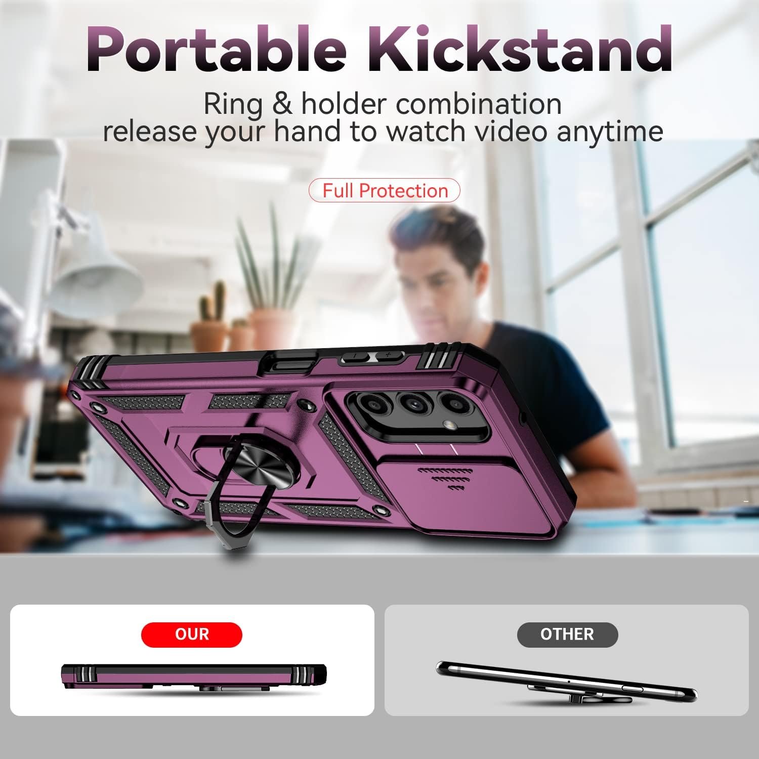 4.360° Rotable Kickstand Design, convenient video browsing;Unique patented technology design, PC integrated shell material, bearing capacity is stronger, firm and not easy to fall off;It can be placed on the table smoothly without wearing out the shell of the phone;360° Rotable Kickstand allows to take your cose easily during work,travel or play