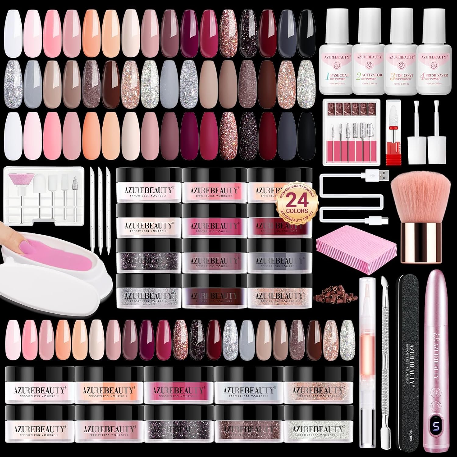 【92Pcs Complete Manicure Kit】 AZUREBEAUTY dip nails powder starter kit includes 24*0.16 oz gorgeous colors of nail dip powder, 4*0.33 oz dip powder liquid set(base coat/activator/topcoat/brush saver), 1*Portable Electric Nail Drill, 11* drill bits, 10 *table mat, 1*Ceramic Corn Head, 1*type-c charging cable, 30*sanding band, 1*cuticle oil pen, 3*nail sticks, 1*nail file, 1*dust brush, 1*recycling tray, 2*liquid replacement brush, 1*storage bag; and user manual quick start guide