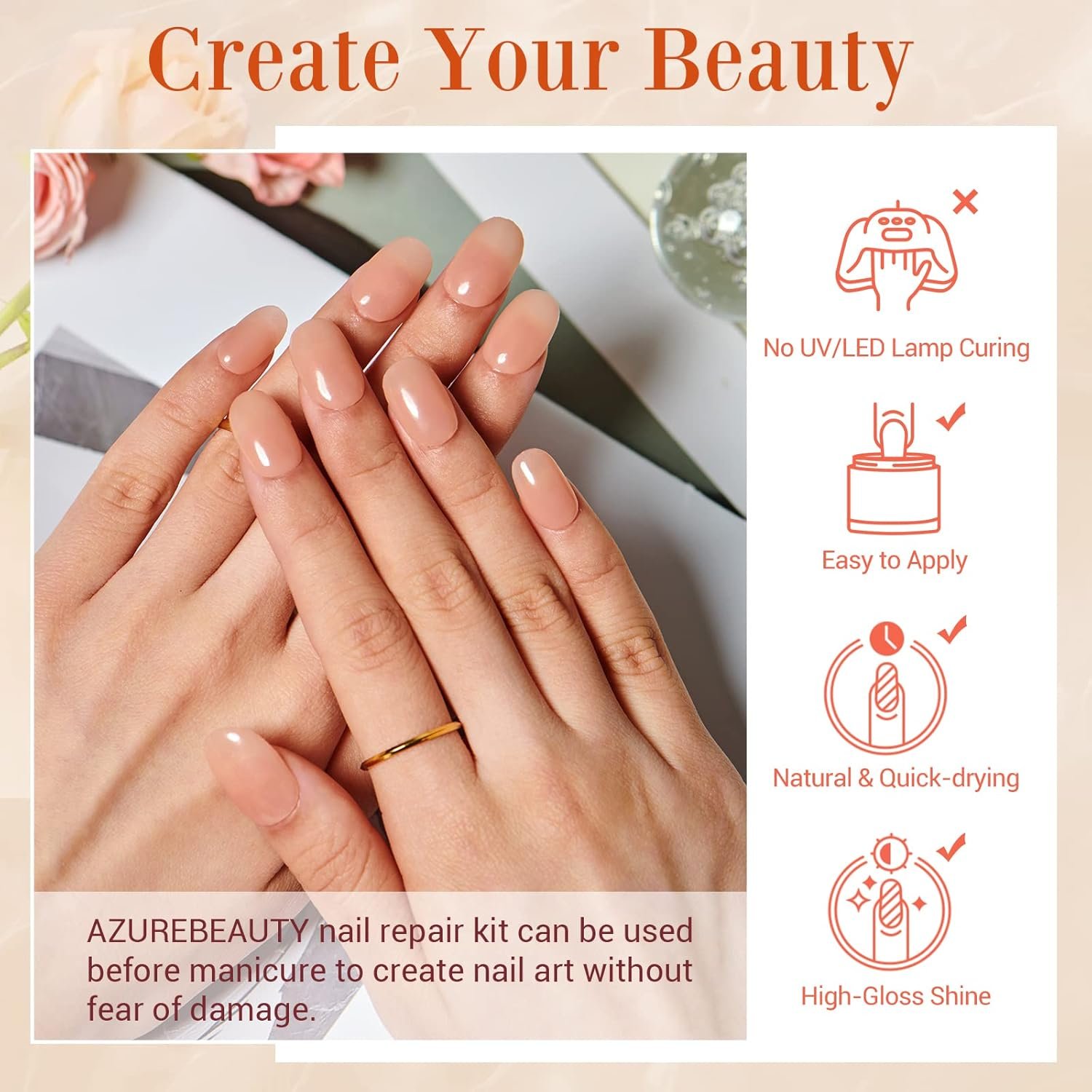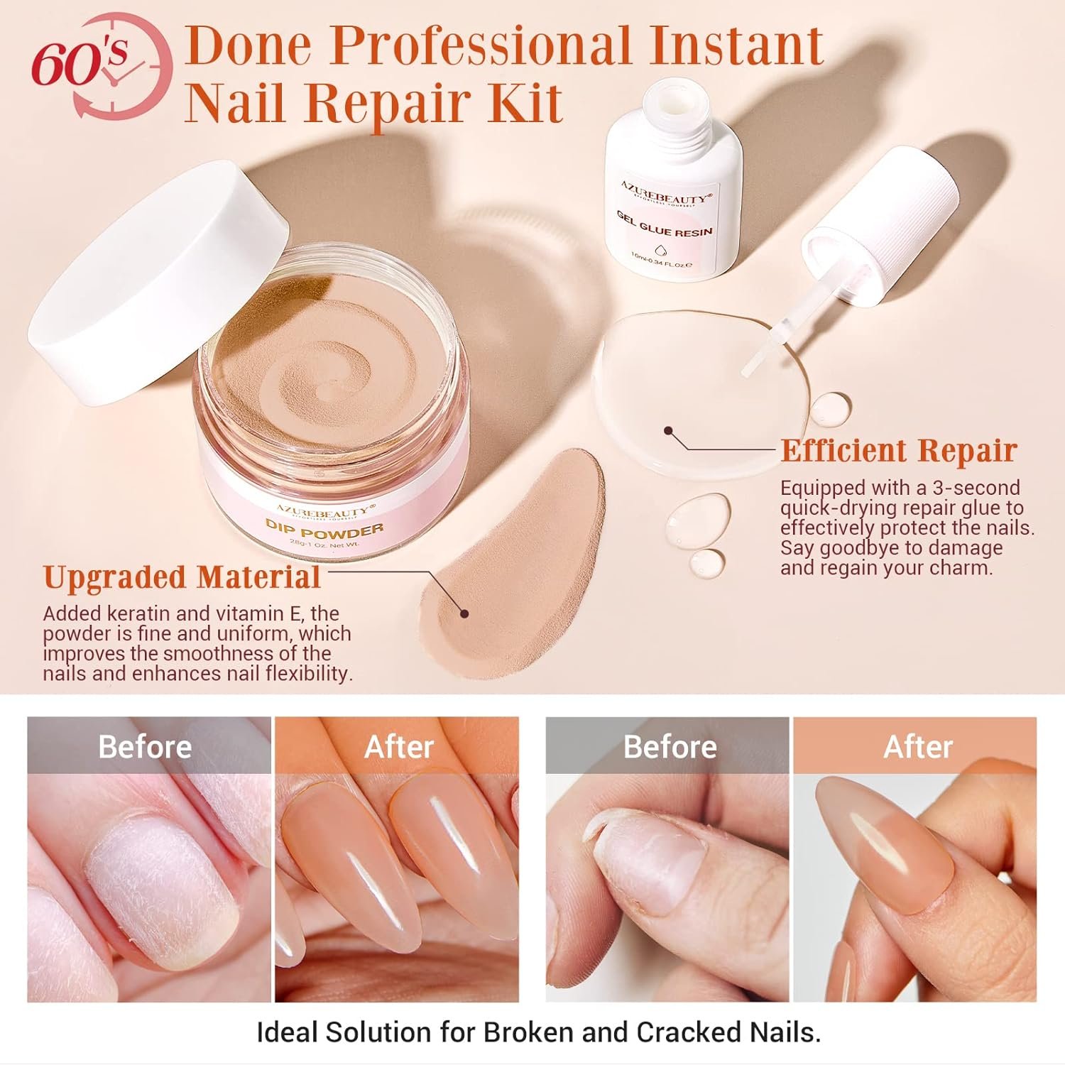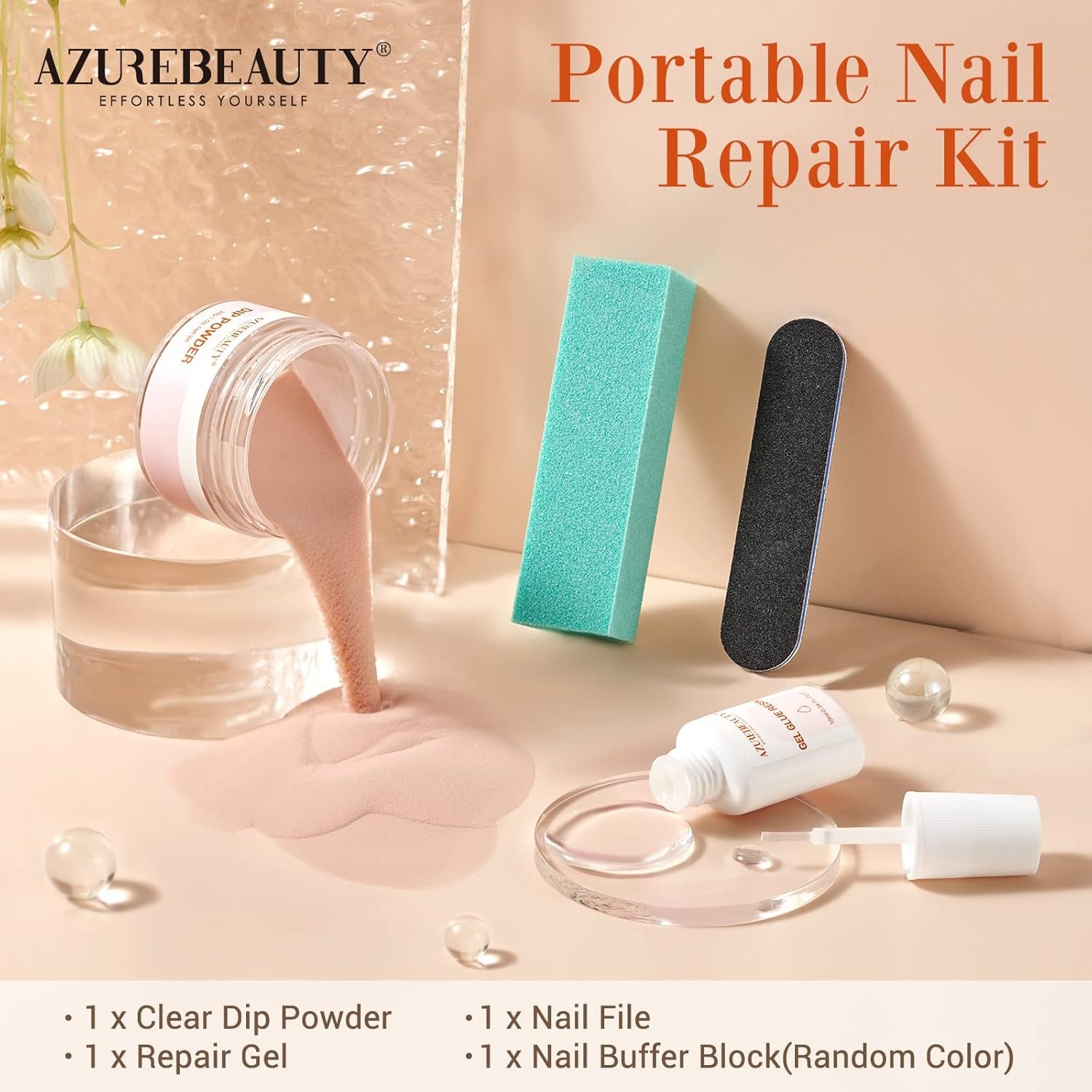 What U Get: Portable nail repair kit comes with 1* Nude Brown Dip Powder(1 Oz/28 g, Close to Natural Skin Tones), 1*Quick-Drying Repair Glue(10 ml), 1*Nail File, 1*Nail Buffer. To repair broken and crack nail tips, AZUREBEAUTY provides a perfect solution for you! Say goodbye to split & weak nails
