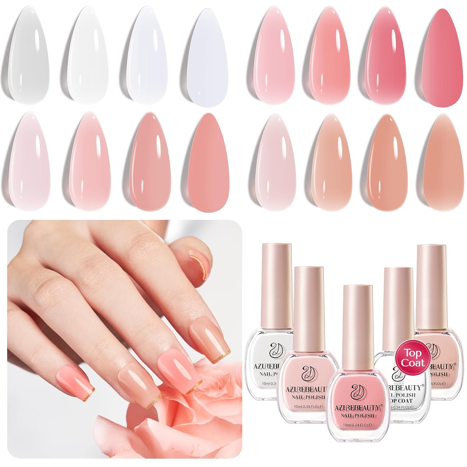 AZUREBEAUTY 4 colors Nail Polish Set: 4* clear white nude pink nail polish, 1* Top coat. This complete one-stop nail polish experience comes in an exquisite packaging gift box, making it the perfect choice for female friends.