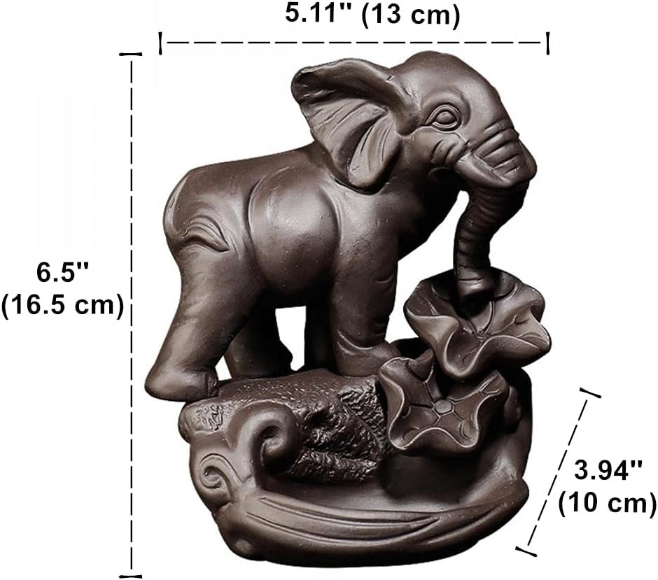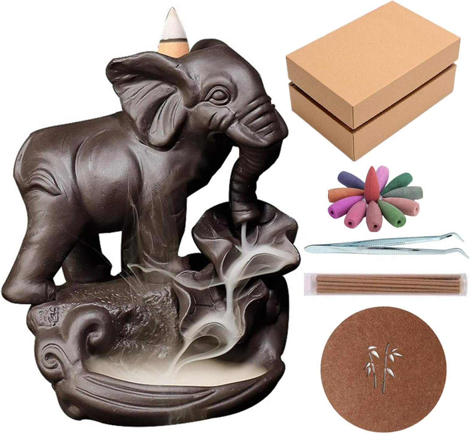 Brand Comeon Material Ceramic Color Dark Brown Workmanship Handmade Package Including Elephant Backflow Incense Holder x 1, Backflow Incense Cones x 20, Incense Sticks x 30, Tweezer x 1, Mat x 1