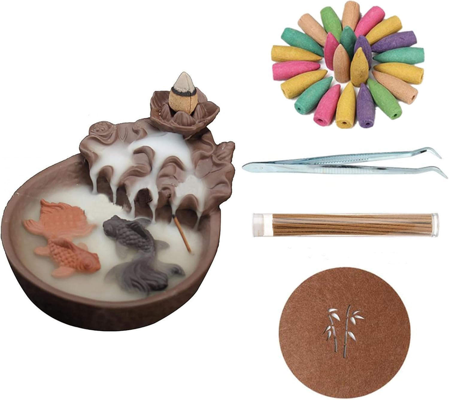 【What You Get】This backflow incense burner kit is paired with 1 goldfish lotus backflow incense holder, about 20 backflow incense cones, about 30 incense sticks, 1 tweezer and 1 mat.