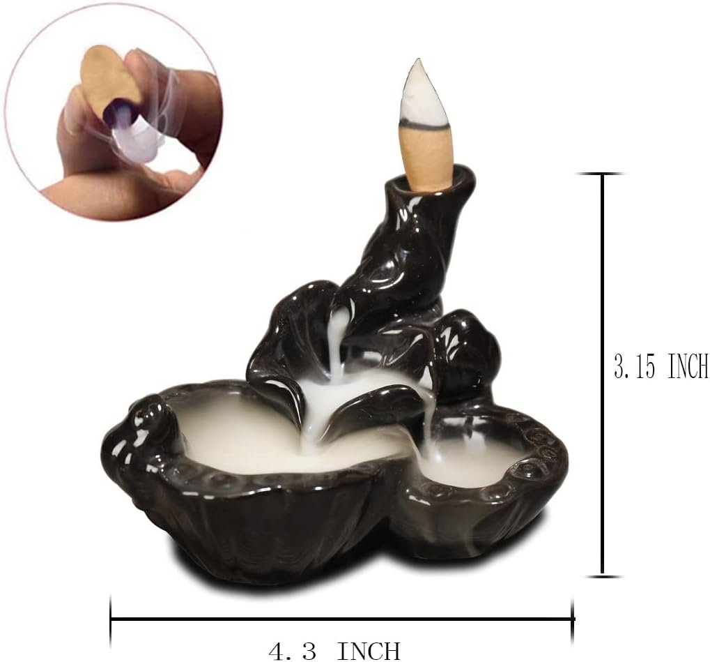 How to Use the Incense Burner: Choose a flat, windless place Lit up the top of the backflow cone, burn it fully in case you have to lit it again Place it on the incense burner, and wait a few minutes, the smog will slowly stream down, a dreamlike waterfall shows Warm Tips: After cones burned, it will leave yellow liquid and ash.Wash it with water, Naturally dry would be great. Application to Living room, bedroom, study, office, meditation room, yoga room, hotel, library, etc. Beautiful and artistic incarnation,Exquisite workmanship, can be a classical furnishings.Get relaxed from the physical to the psychological, Put aside the troubles of life, Enjoy the peace of this moment.