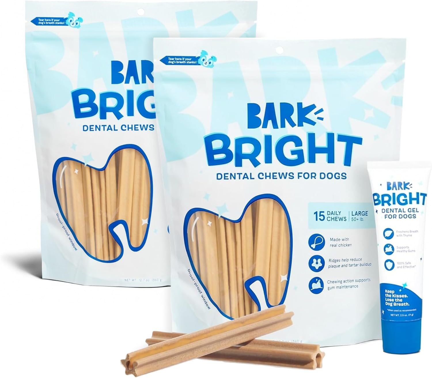 Irresistibly Delicious: Dive into the Bright dog breath freshener experience with BarkBox dental chew sticks and gel, enriched with flavors of chicken and thyme. Your dog won’t be able to resist the tasty combination that makes dental treatment enjoyable