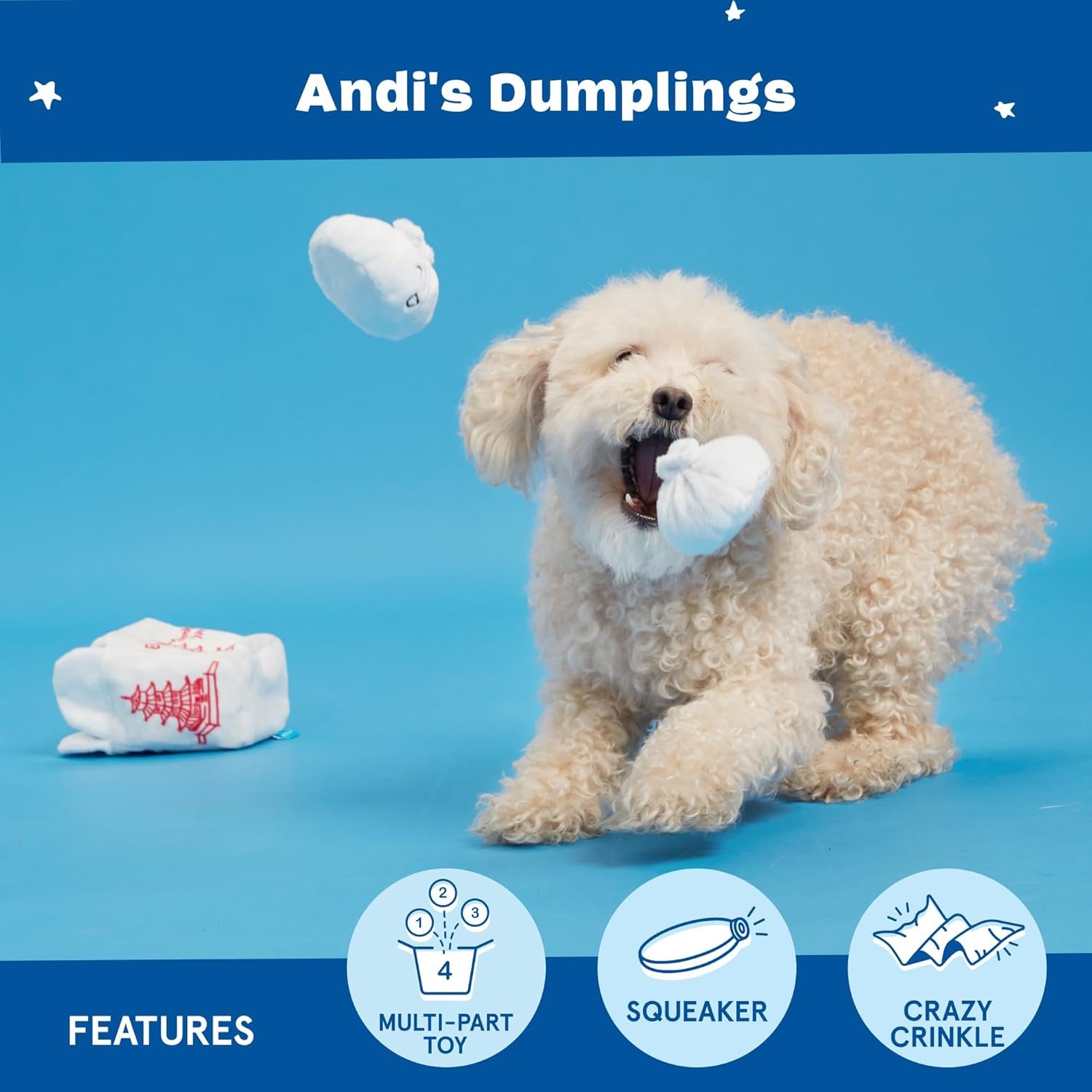 MEET ANDI’S FAMOUS DUMPLINGS – Satisfy your dog’s instincts with this 2-in-1 crinkly carry-out carton stuffed with plush and squeaky dumpling balls! Perfect for fetching fun and mental stimulation, this toy will keep your dog busy and happy. Keep the carry-out carton away from the fridge – your dog won’t want to miss out on this delicious delight.