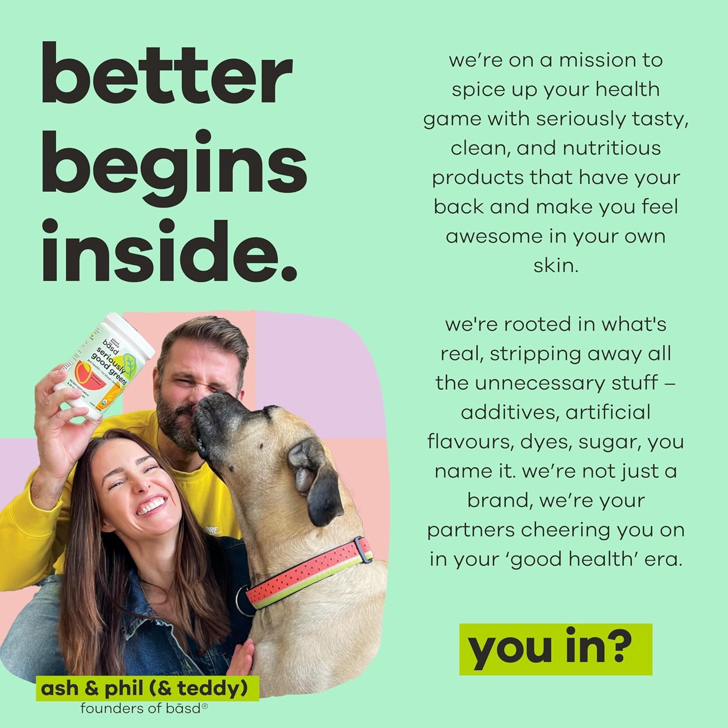 Introducing basd seriously good greens; deliciously healthy, plant-based daily greens with antioxidants and 23 superfoods. The goal was to get as pure as possible, stripped down to the most natural, straightforward goodness of greens. Real food-based nutrition crafted with Mother Nature’s best-kept ingredients, straight from the roots. With added immunity, gut, and no-bloat benefits, this plain jane (& srsly good) addition to your health and wellness routine is the game-changing experience you’ve been looking for. Add it to your smoothie concoction or take it straight first thing in the morning to prime your body for maximum success throughout the day. Greens just got a whole new attitude. Available in au naturel, unsweetened and tropical paradise.