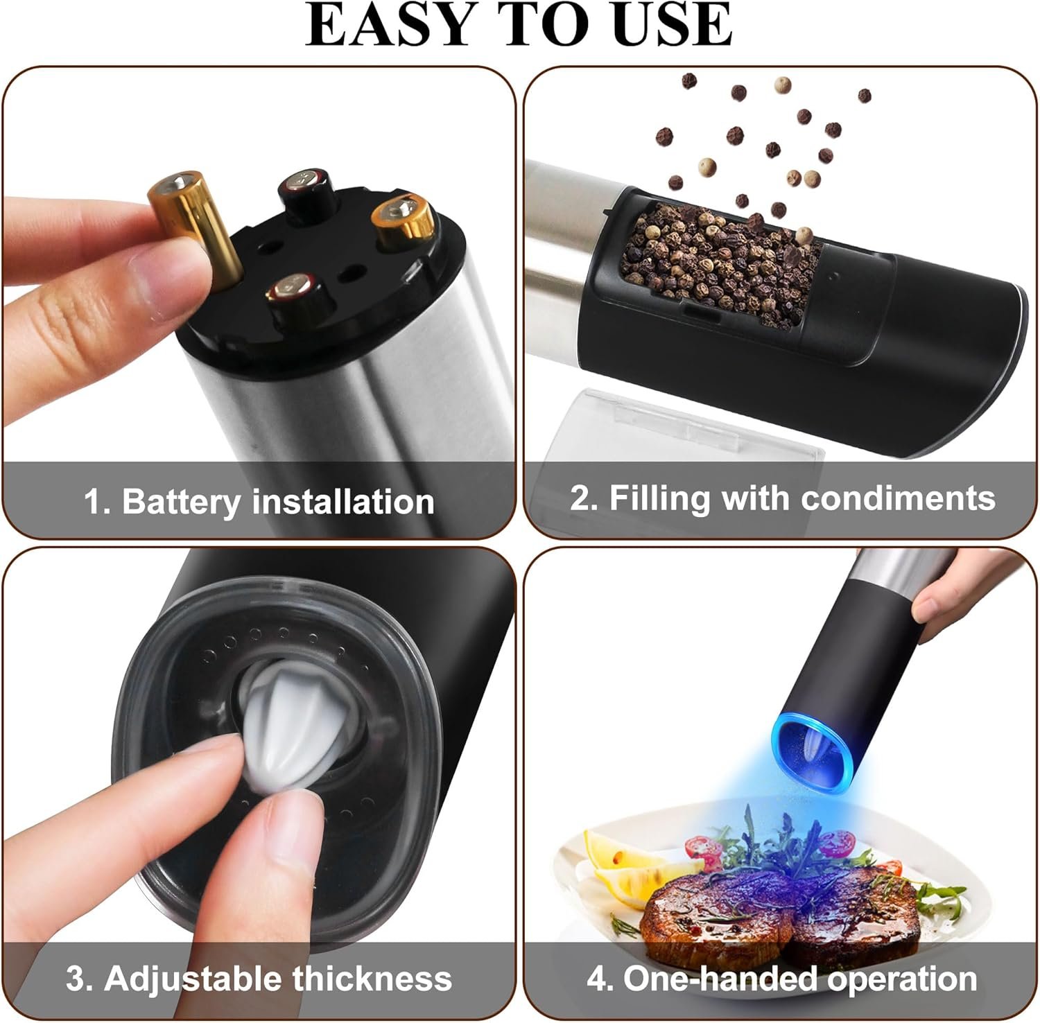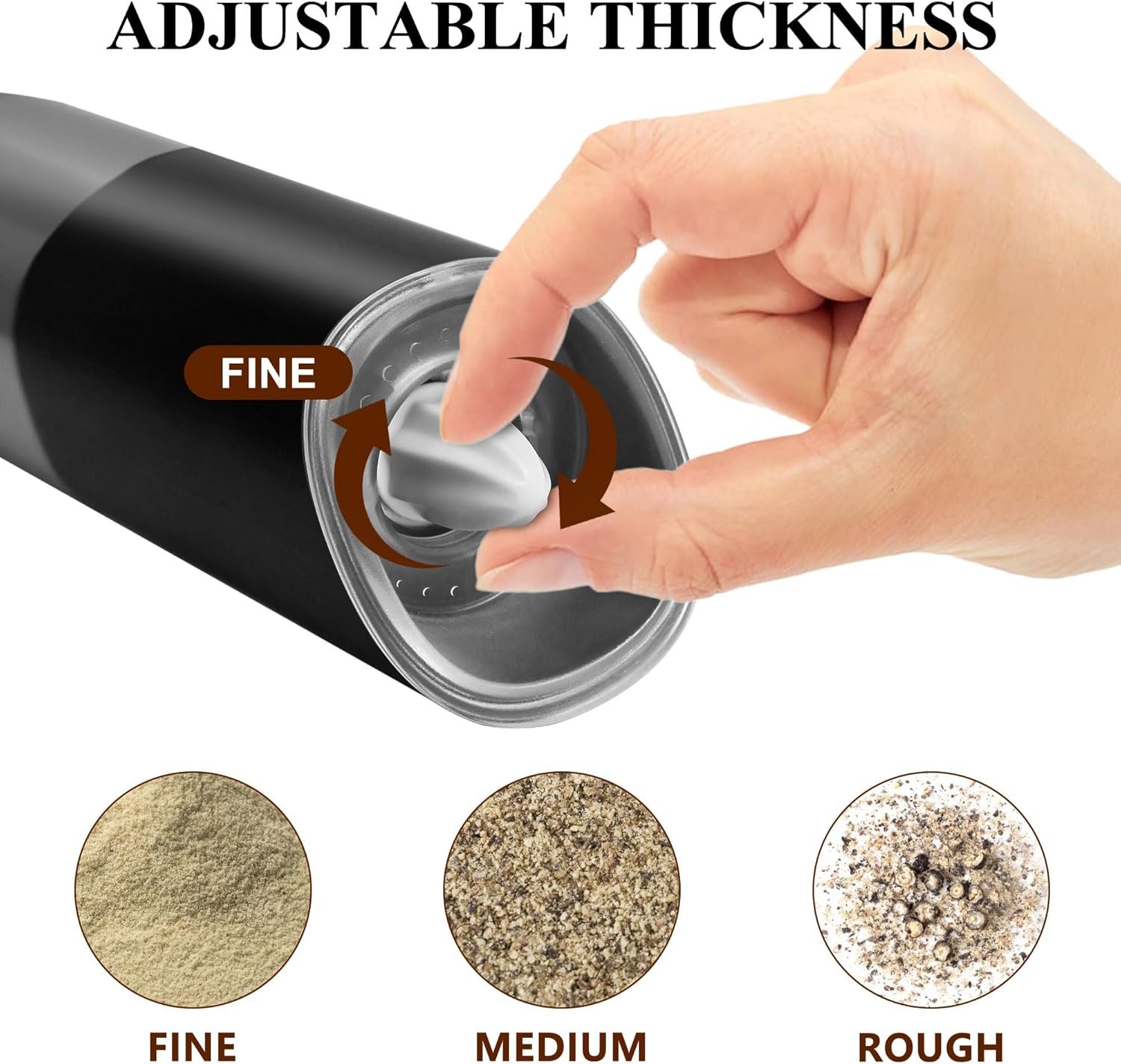 【Adjustable Coarse & Fine】Battery operated electric salt and pepper shaker grinder comes with an adjustable ceramic grinder knob with a built-in high quality ceramic core that makes it easy to adjust the coarseness or fineness of your spices.