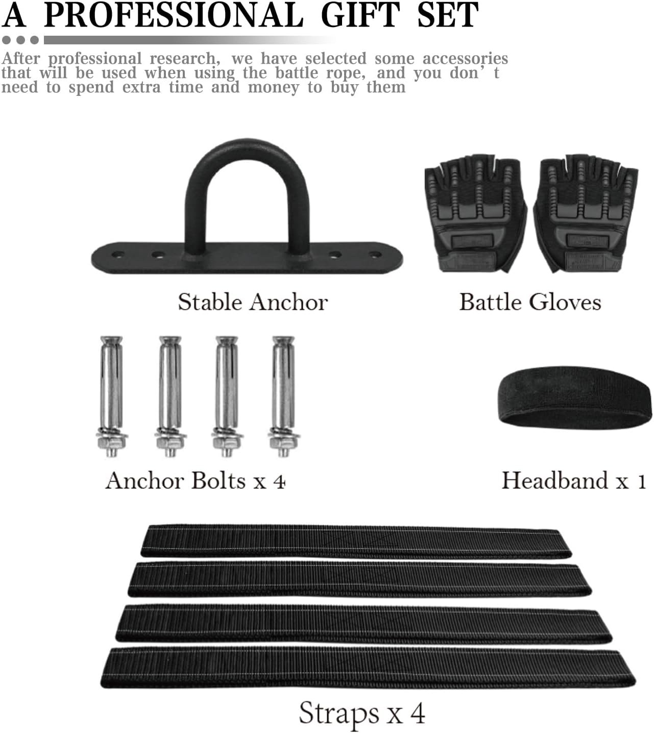 Workout Rope Includes Gloves and a Sweat Head Towel as a gift: In order to prevent palm bruises or calluses, we gave gloves as gifts. We also added sweat towels to the package to make the gym rope more convenient for you to use. Stable anchor, Anchor Bolts*4, Straps*4 are also presented in this package.