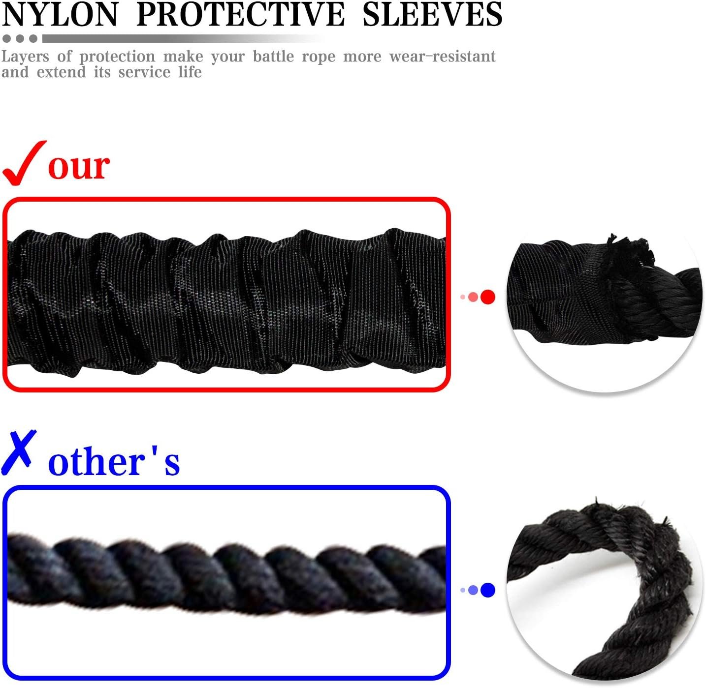Battle Rope with Durable Polyester Filament Material: An extra protective cover is added to the outer layer,high tensile strength exercise rope prevents breaking, abrasion, or loosening which more durable than the others without sleeve. the battle rope is an ideal choice for beginners and serious fitness enthusiasts for home gym and outdoor exercise. The comfortable coated handle protects your hands and provides a firm grip for all your training and exercises.