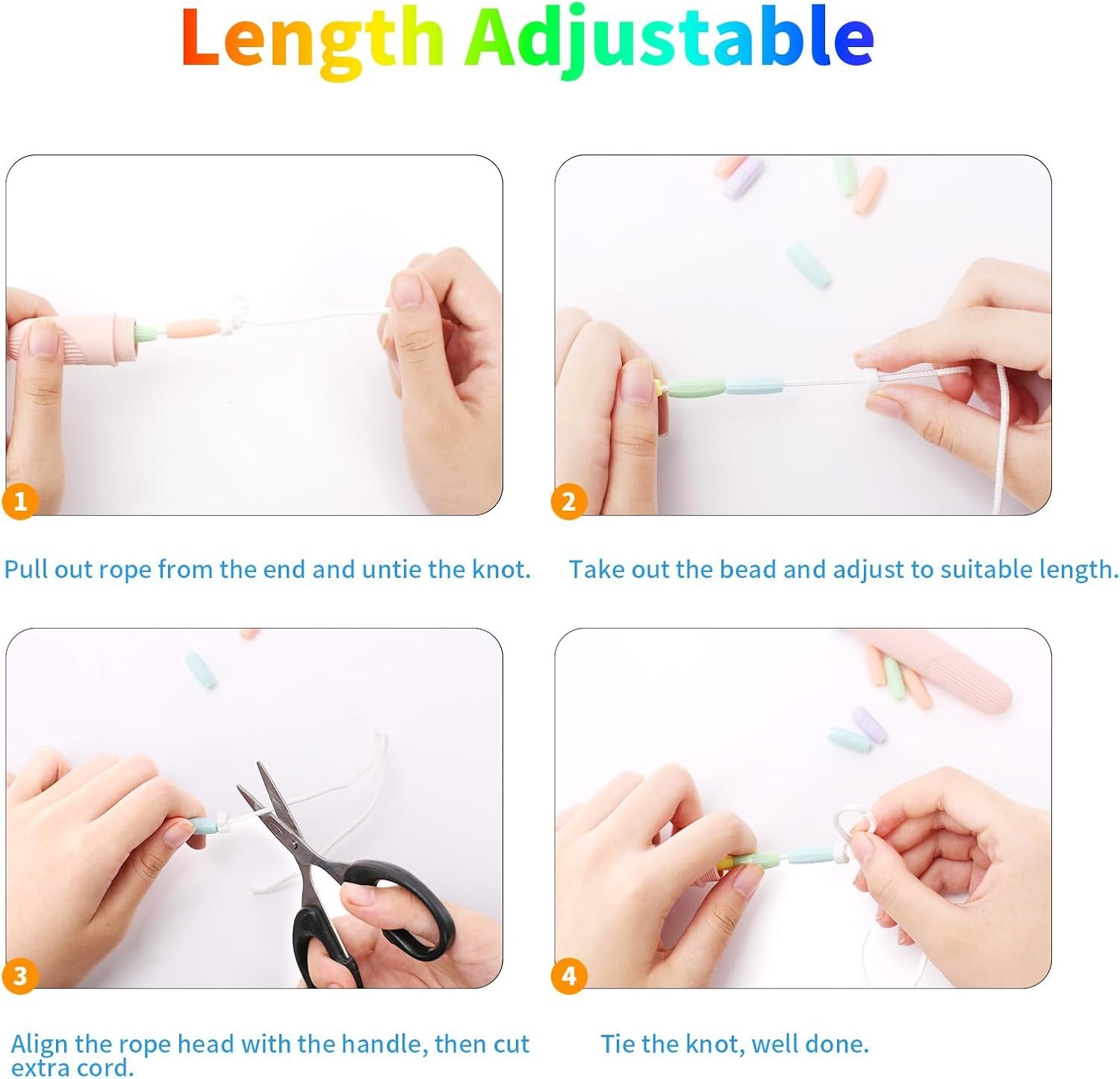 Adjustable Jump Rope: The length of jumping rope kids is 8.5ft/2.6m, very suitable for kids/students. It’s easy to adjust – simply untie the knot inside the handle, remove the desired number of beads, and retie the knot to shorten the rope to the preferred length.