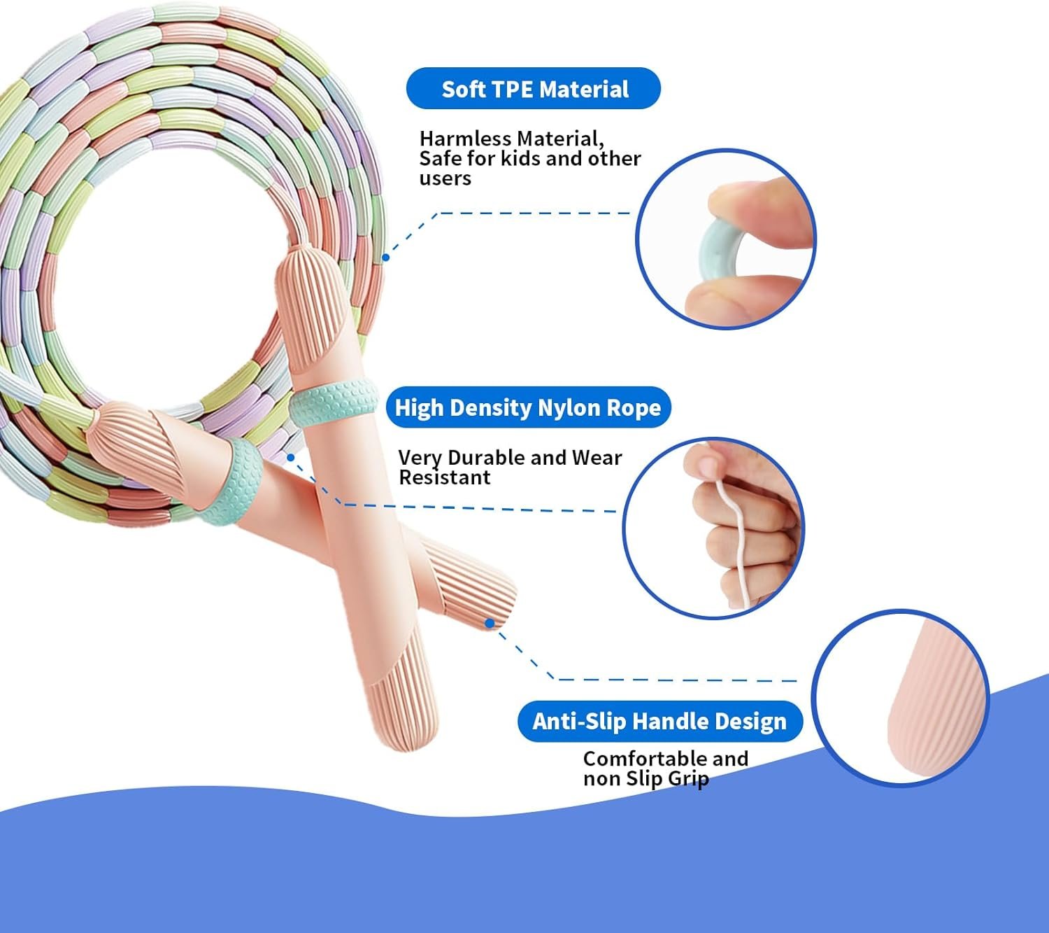 Comfortable Anti-slip Handle: The handle of jumpropes for children is ergonomic with roman column design, the thumb naturally grips the positioning ring and the other fingers are naturally curved, make sure a comfortable and secure no-slip grip for small hands.