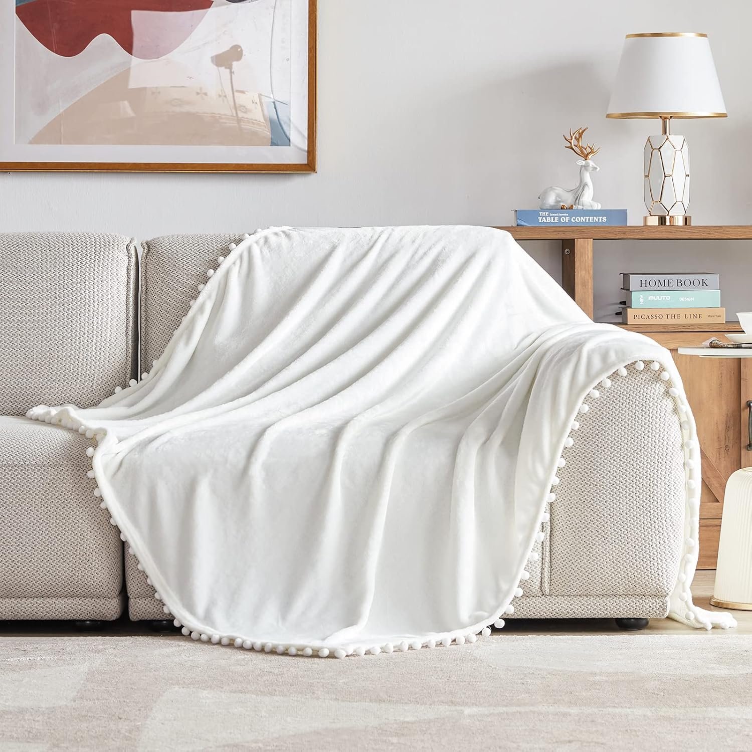 【POMPOM FRINGE DESIGN】 Dotted with delicate pompom tassels around the edge of the Beige throw blanket for decorative throw blankets.your dog, cat or pets will love this cute blanket. The premium item to add color, pattern, and boho decor for living room. Mix it up with your decor, drape it over your couch, sofa, accent chair or bed to add bright style to your living room or pop of color to your bedroom