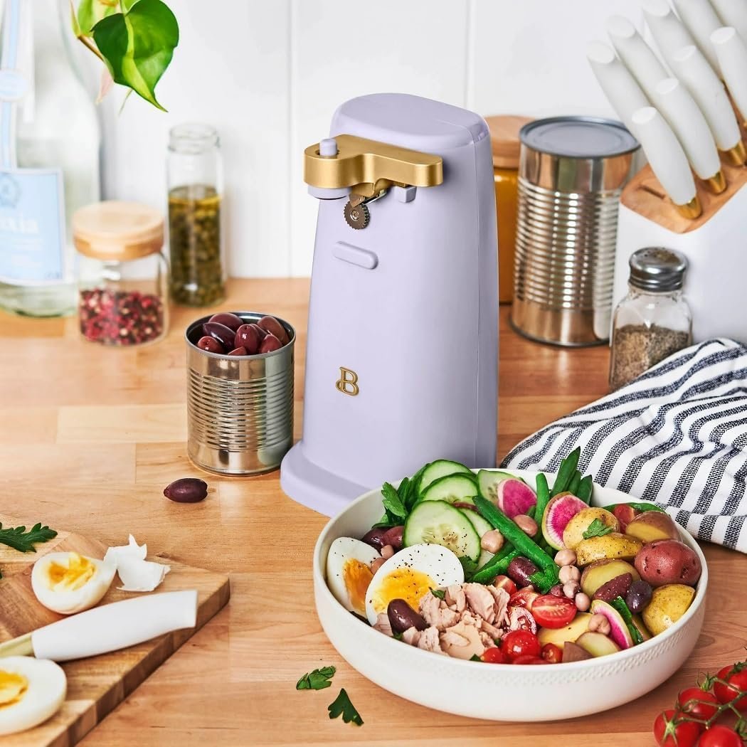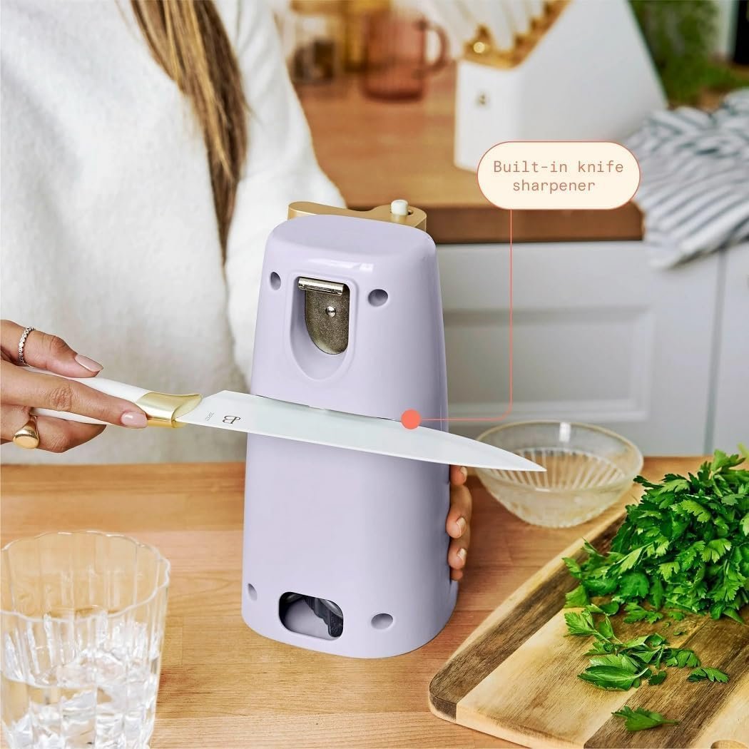 Streamline your mealtime prep with the Beautiful Easy-Prep Electric Can Opener. A stainless steel cutting blade and magnetic lid holder combine to open small, standard and tall cans with ease. This handy can opener also includes an auto-turn feature for convenient one-touch operation and a removable lever for easy cleaning, helping you get to your cooking tasks faster. It’s innovative no-tilt design keeps it steady too, for a worry-free prep. Plus, it also includes a built-in knife sharpener and bottle opener making it a true workhouse in your kitchen. A convenient cord storage compartment makes it easy to tuck away when not in use. Available in White Icing with signature gold accents