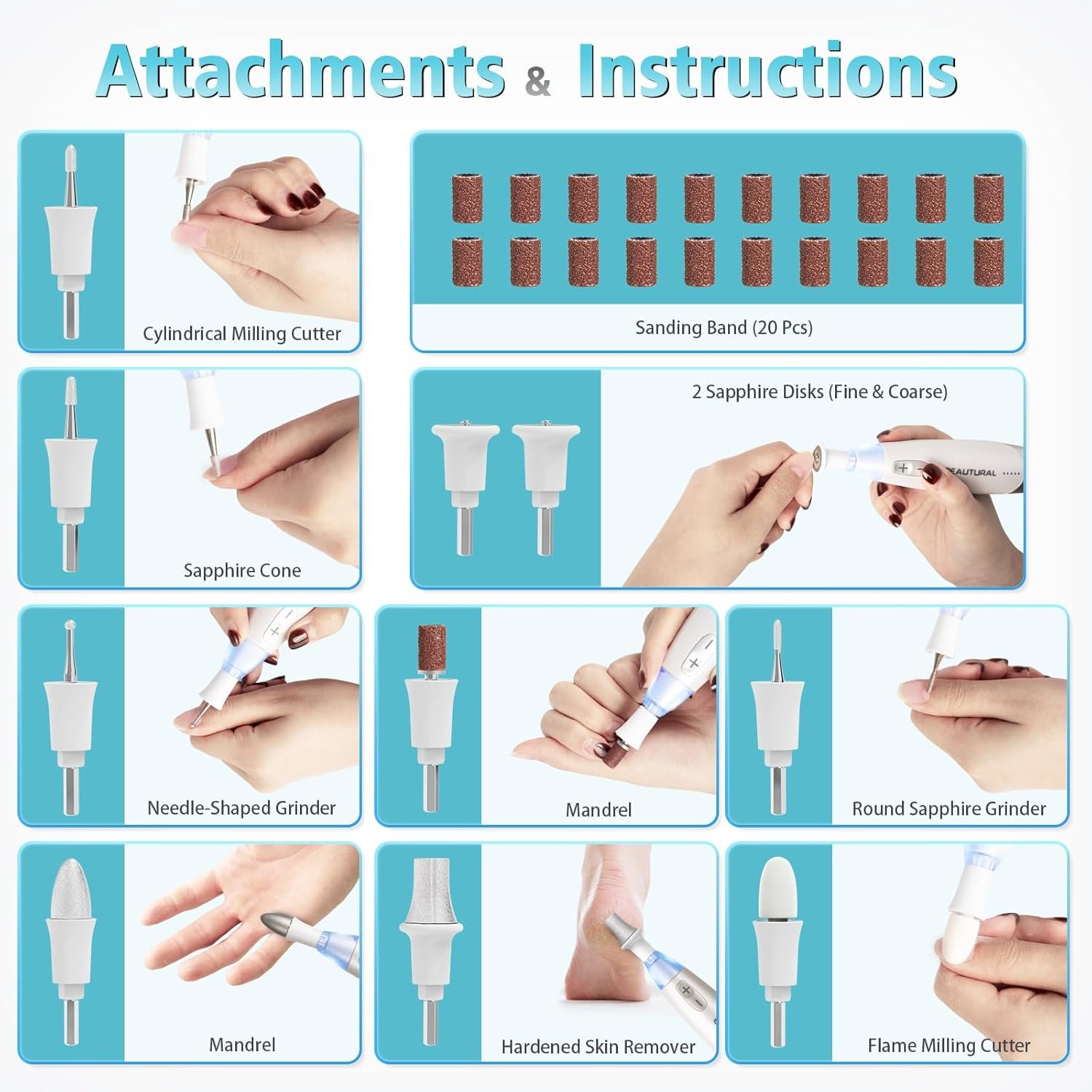 10 High-Quality Kits: The nail file set is equipped with 10 different attachments and 20 sanding bands for removing cuticle dead skin, thick nails, acrylic nails, poly gel nails, artificial extension nails, builder gel, dip powder, and fake nails